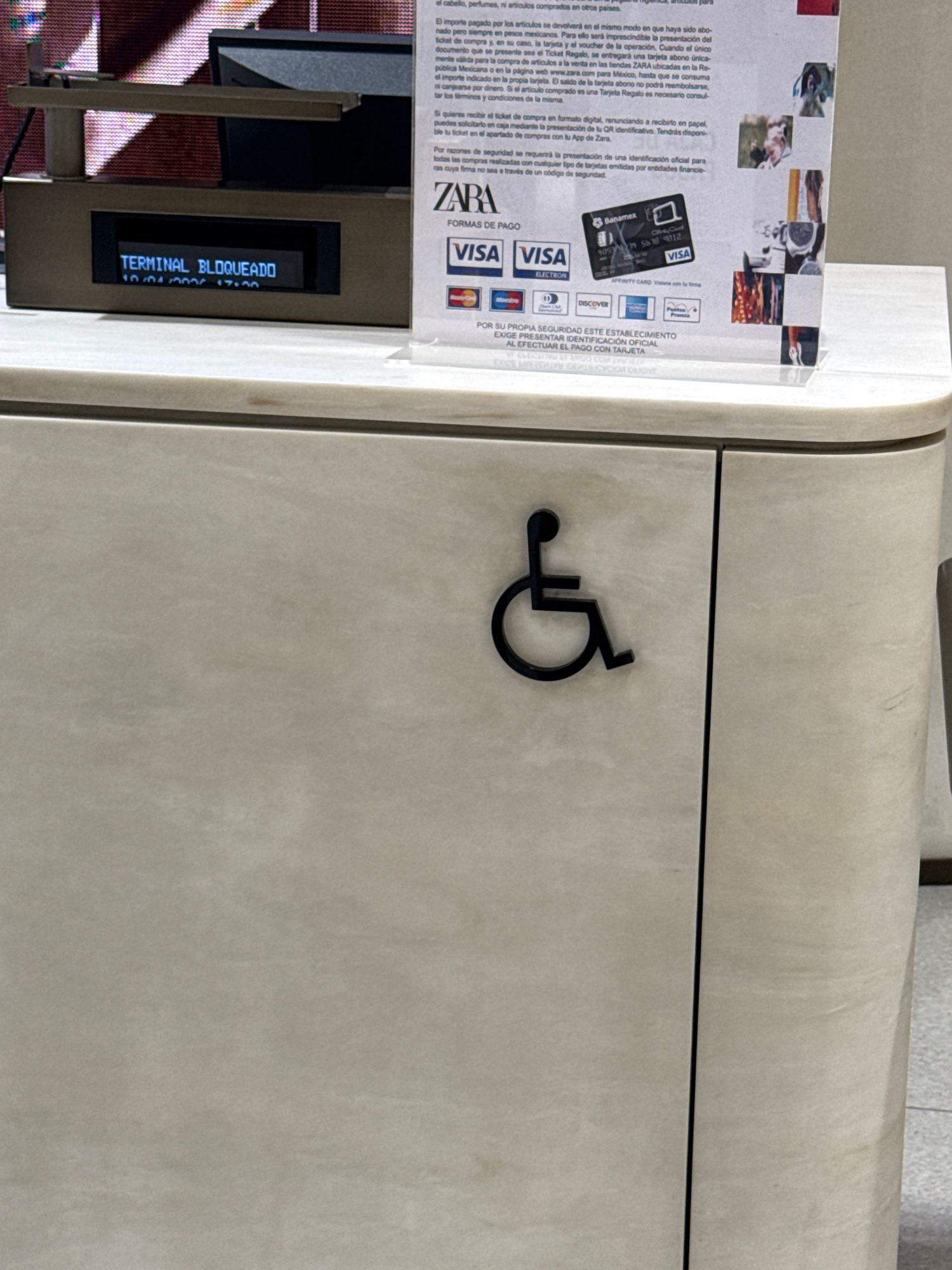 This indoor shot captures a modern, minimalist setting, likely a Zara store in Puebla, Mexico, given the presence of Spanish text and payment details specific to Mexico. The composition focuses on a p…read more