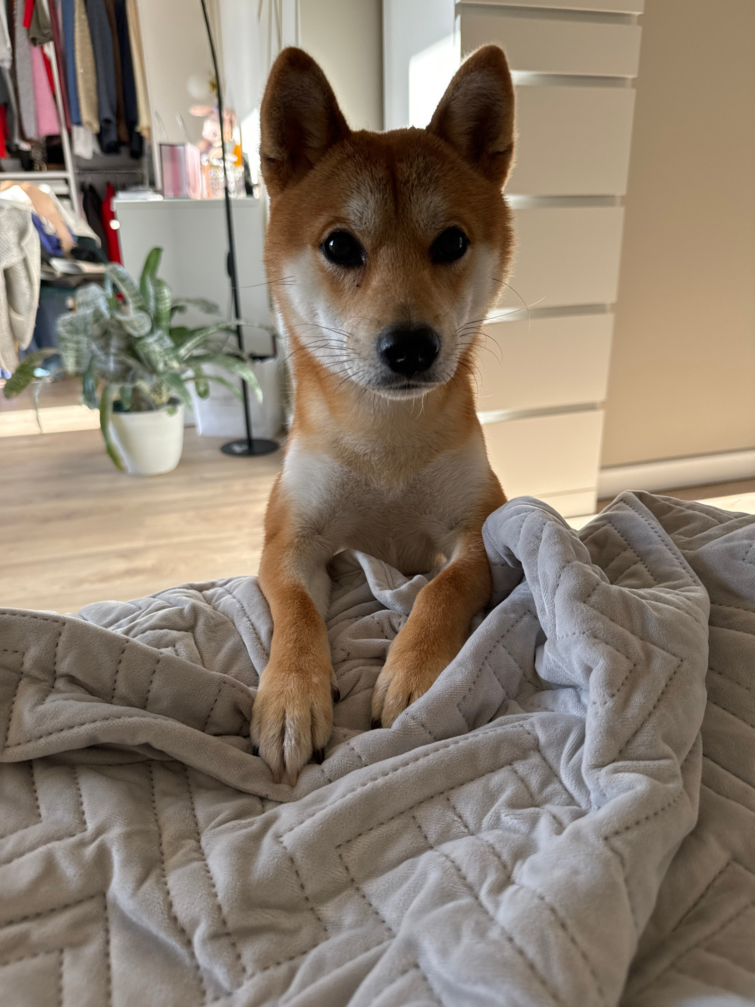 A Shiba Inu dog lies partially covered in a grey quilted blanket. The dog's head is oriented towards the viewer, with its ears erect and focused gaze. Visible behind the dog is a cabinet with light-co…read more