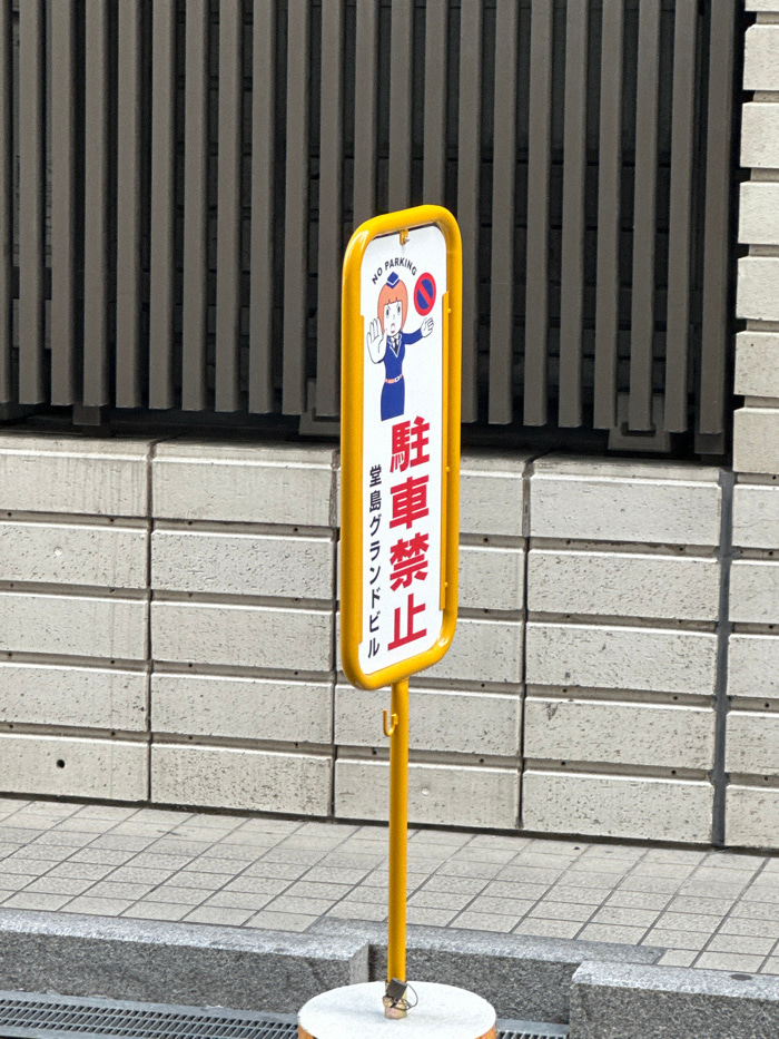 A yellow rectangular sign with rounded corners features a cartoon woman in a blue uniform with a red circle and diagonal line over a car, indicating "No Parking." Japanese text, including "駐車禁止" (Park…read more