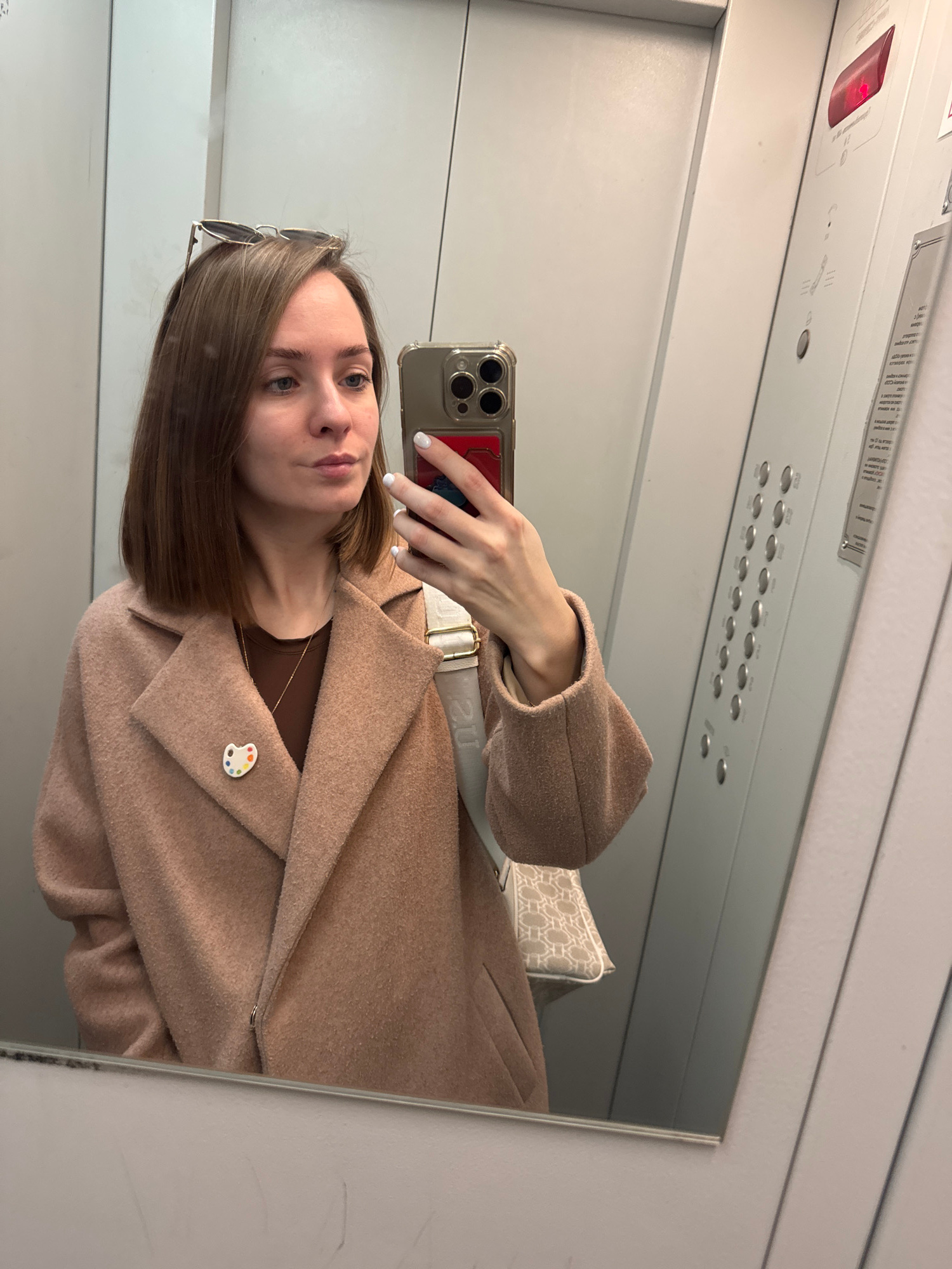 The image is a selfie taken in what appears to be an elevator. A young woman with light brown hair is holding a smartphone, a newer model possibly an iPhone based on the camera design, to capture her…read more