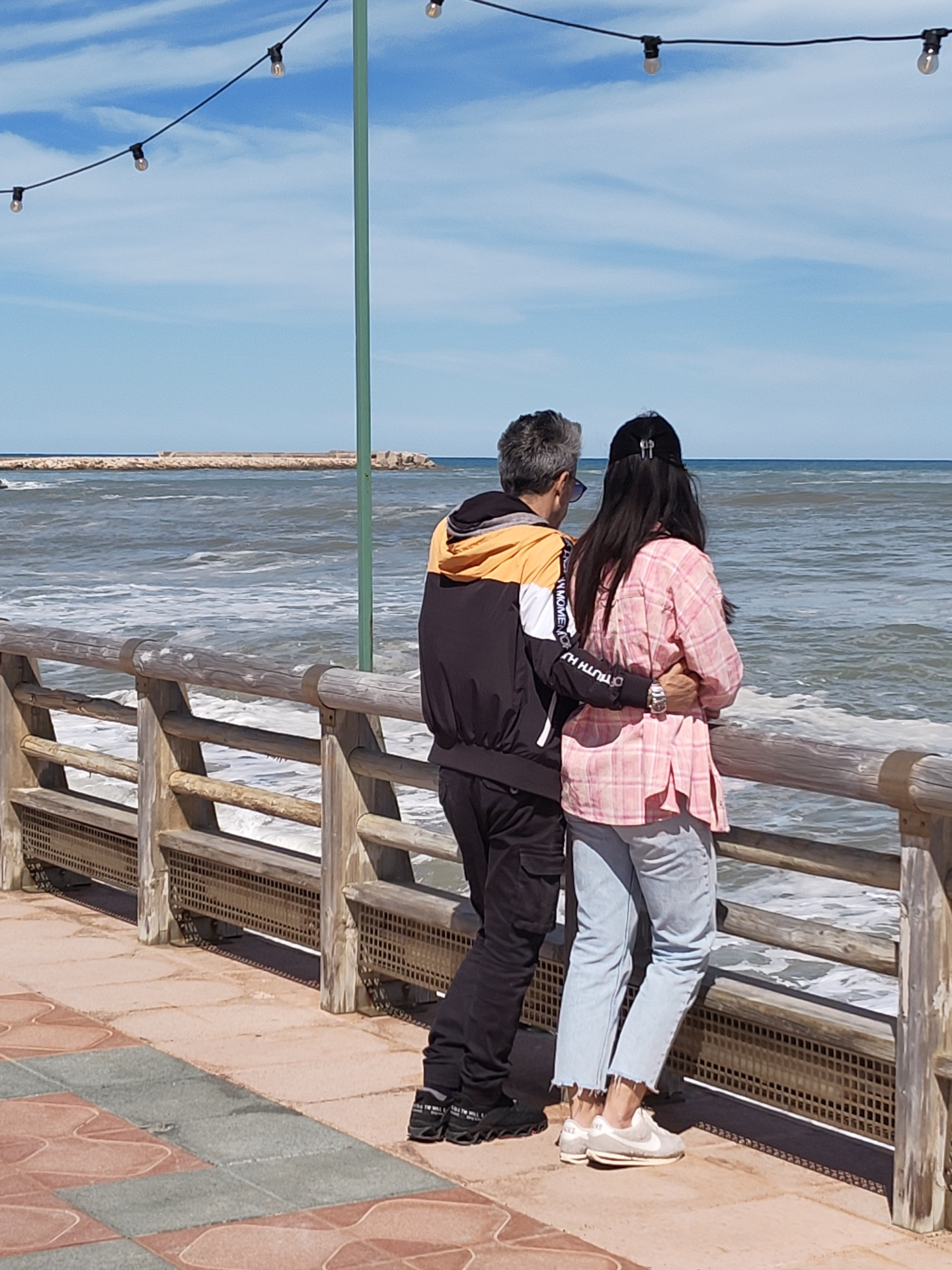 A man and a woman stand embracing at a wooden railing overlooking the Mediterranean Sea in Dénia, Spain. The man is on the left, wearing a black jacket with yellow and white accents, black pants, and…read more