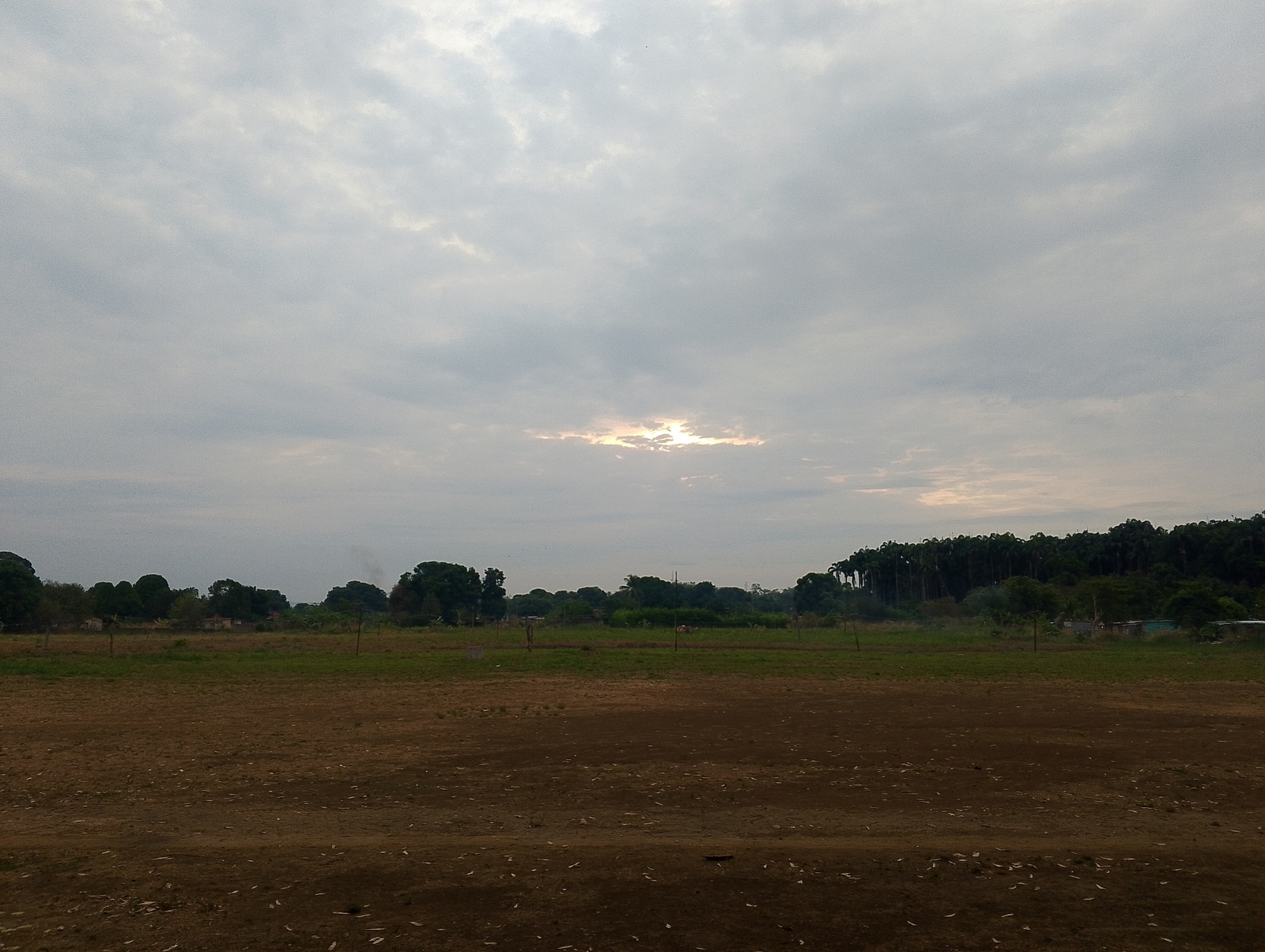 The image presents an overcast landscape, likely in a rural or semi-rural setting. The ground in the foreground is predominantly brown earth with scattered debris, possibly dried leaves or small stones. Beyond the foreground, there's a field with patches of green vegetation. In the mid-ground, there are scattered trees and shrubs, with some appearing denser than others. A line of tall, dense trees is visible on the horizon, possibly indicating a forest or wooded area. The sky is heavily clouded with a small, obscured area where the sun might be breaking through. The lighting is generally diffused due to the cloud cover. There are no people visible in the scene. The specific location in San Carlos, Venezuela cannot be determined with certainty based on the visual information alone. | Open Wire