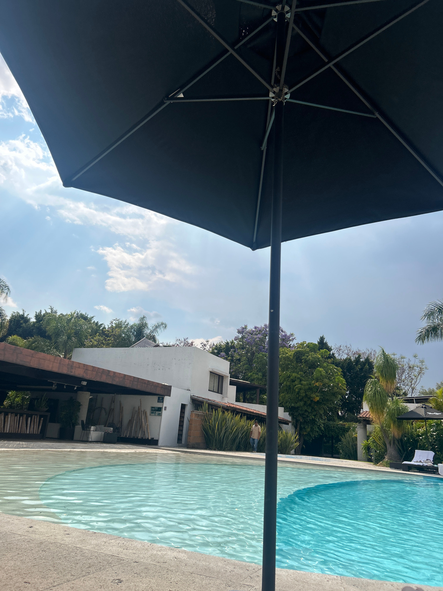 A ground-level shot looking up shows part of a swimming pool and a black patio umbrella on a sunny day. Ripples are visible on the surface of the water. Behind the pool, there is a white building. Lus…read more
