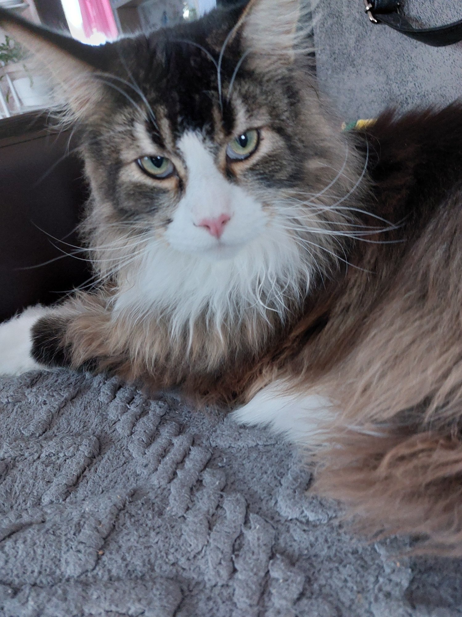 A medium-shot, eye-level photograph depicts a long-haired cat, oriented sideways, resting on a gray textured surface. The cat has a gray and black tabby face with white markings, a pink nose, and gree…read more