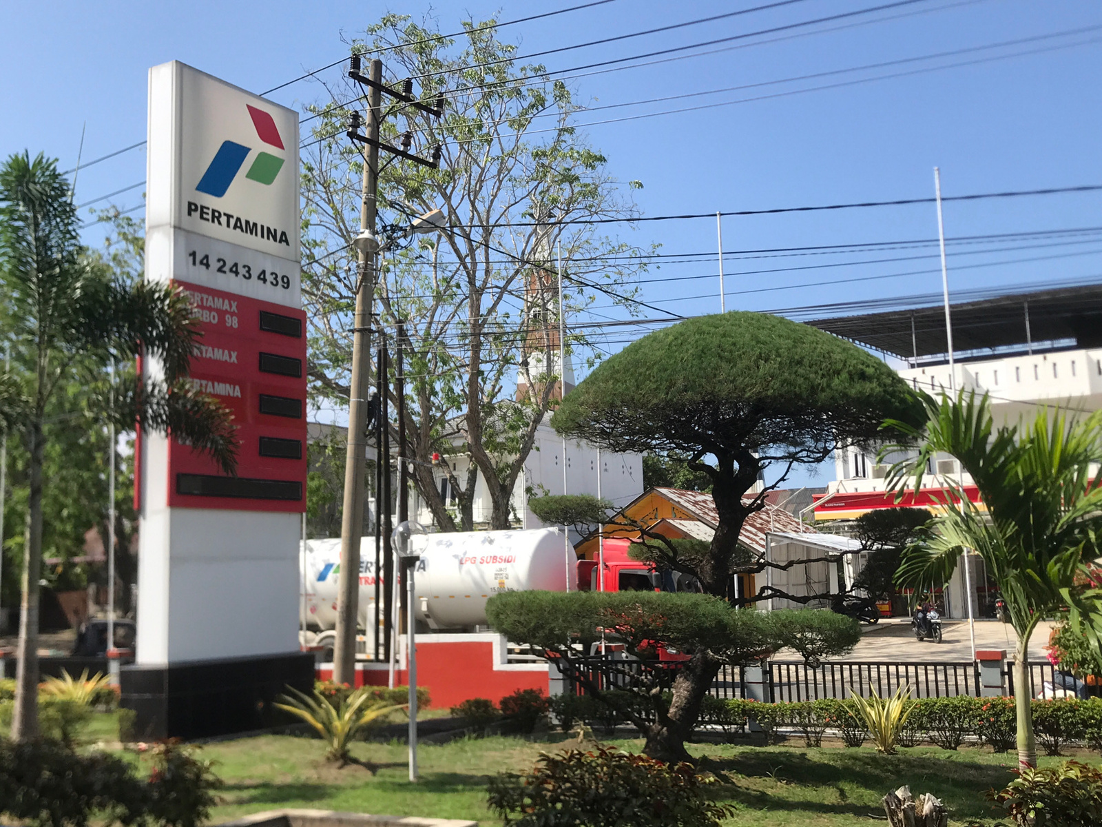 Here is a detailed description of the image: The image shows a Pertamina gas station in Lhokseumawe, Indonesia, on a sunny day. A tall, white sign with the Pertamina logo and pricing information stan…read more