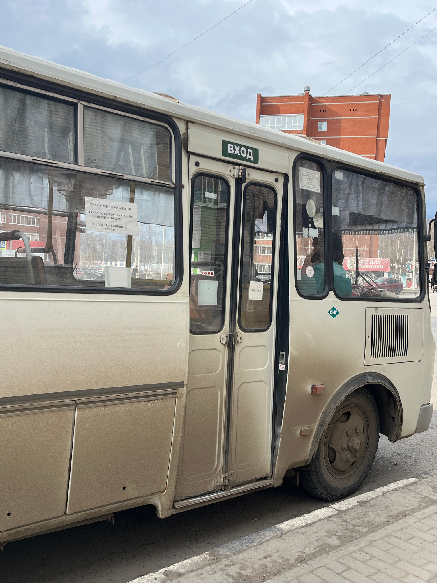 The image depicts a dirty, beige-colored public transportation bus parked along a sidewalk in what appears to be the city of Chaikovsky, Russia. The bus displays signage in Russian script. Notably, a…read more