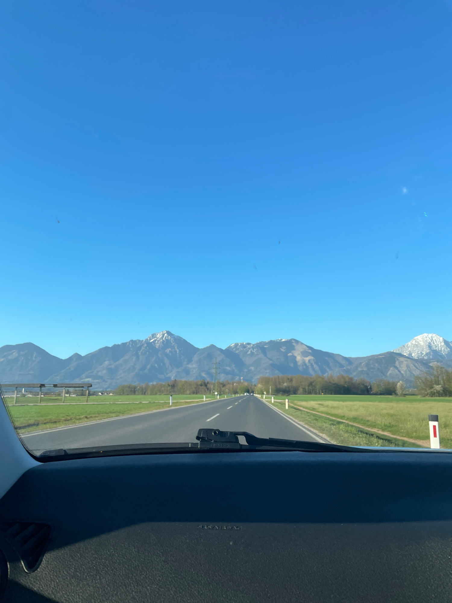 The image shows a view from inside a car driving on a road towards a mountain range under a clear blue sky. The road is flanked by green fields and some sparse trees. A portion of the car's dashboard…read more