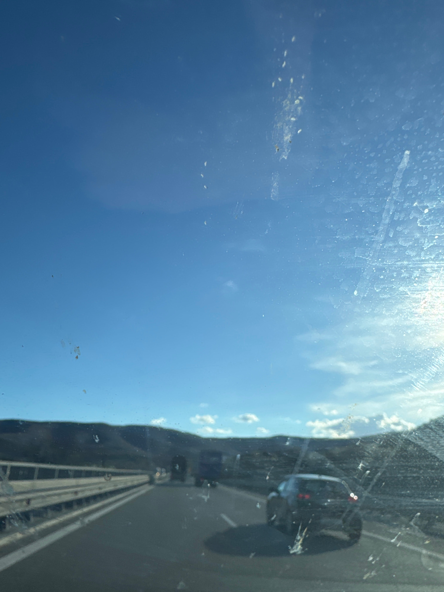 The image shows a view through a dirty car window. Outside the window is a bright blue sky with some clouds. On the right side of the frame, there is a blurred view of a highway, possibly an elevated…read more