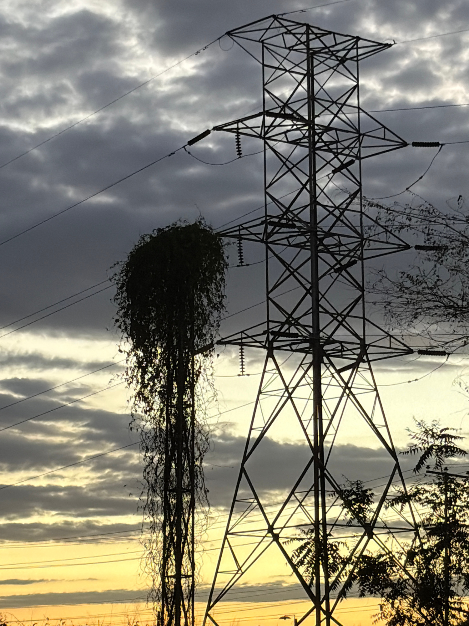 The image shows a metal electricity pylon silhouetted against a sky with a distinct color gradient, transitioning from dark grey and white clouds on the left to a yellow-orange hue on the right. The p…read more