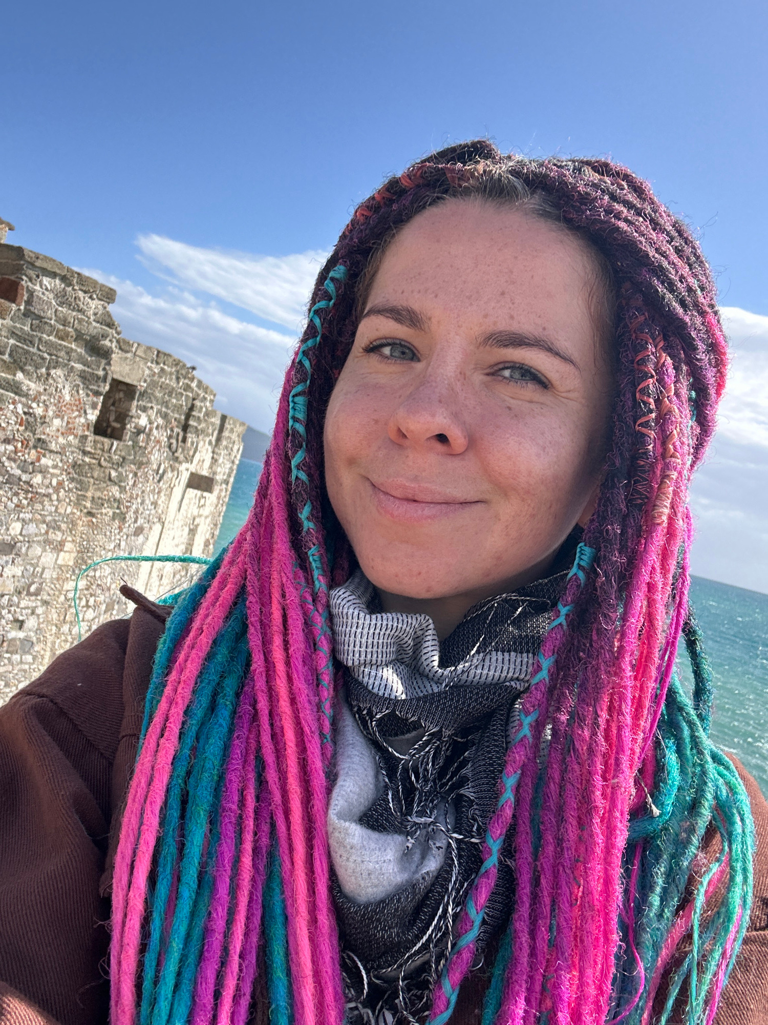 A selfie shows a fair-skinned woman with freckles and pink, purple, and teal dreadlocks, posed against a backdrop of a stone fortress and the sea. She wears a scarf and a brown jacket. The weathered s…read more