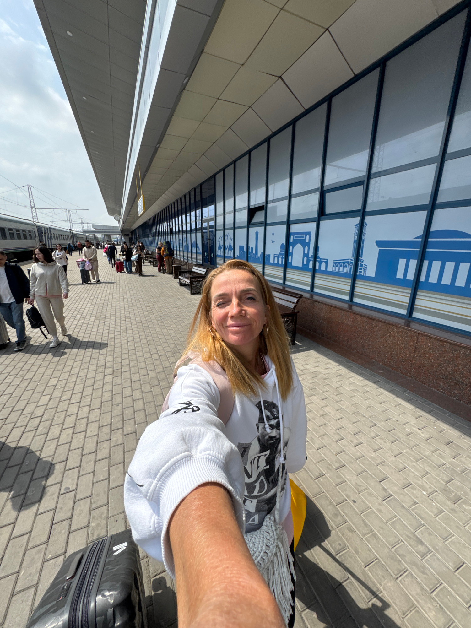 A selfie of a woman with a fair complexion and blonde hair standing outdoors on a brick-paved surface. She is wearing a white sweatshirt. Behind her is a building with a glass facade decorated with bl…read more