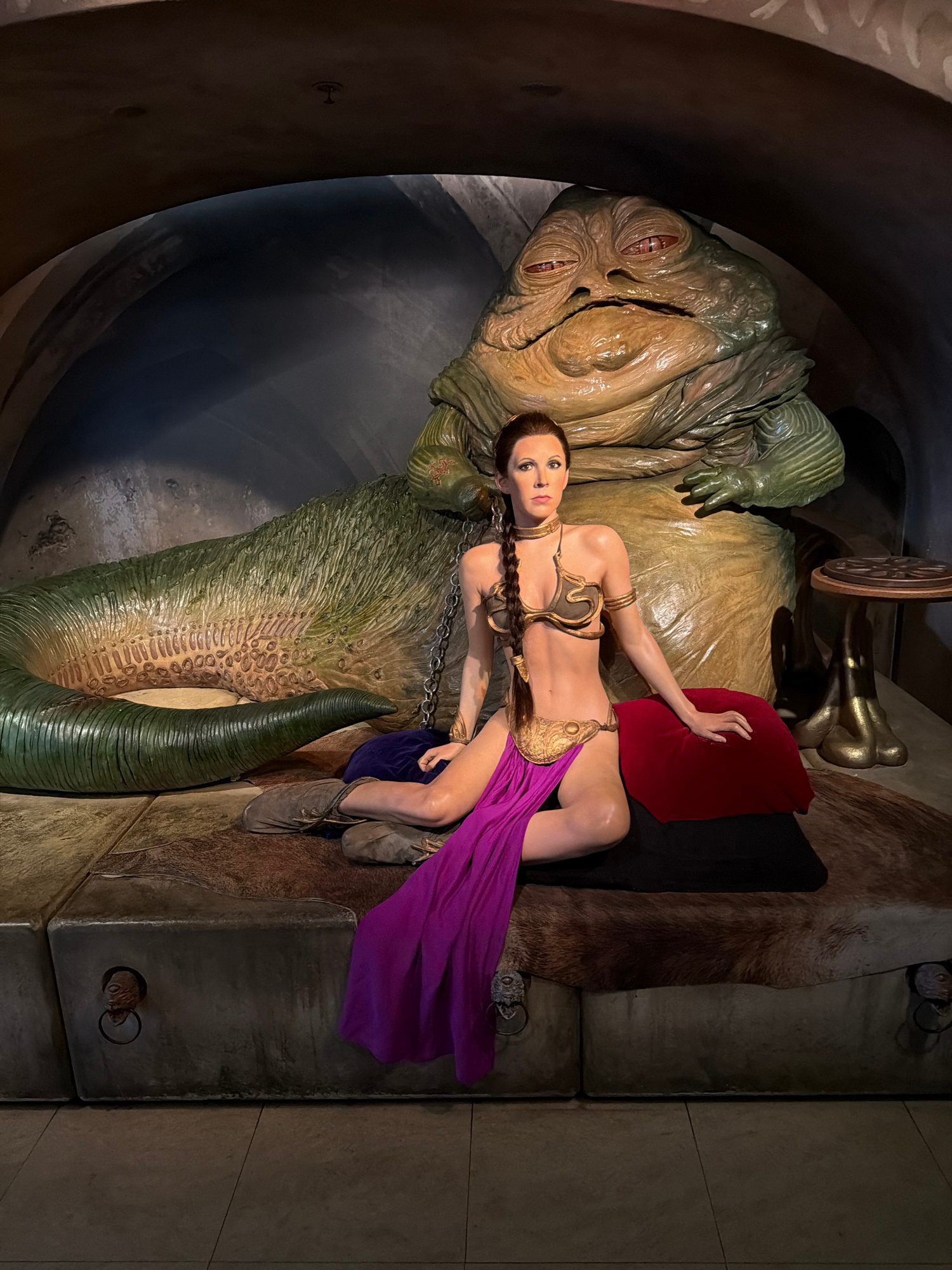 The photograph shows a wax figure tableau of Jabba the Hutt and Princess Leia in her slave outfit from "Star Wars: Return of the Jedi". The tableau is displayed in what appears to be a recreation of J…read more