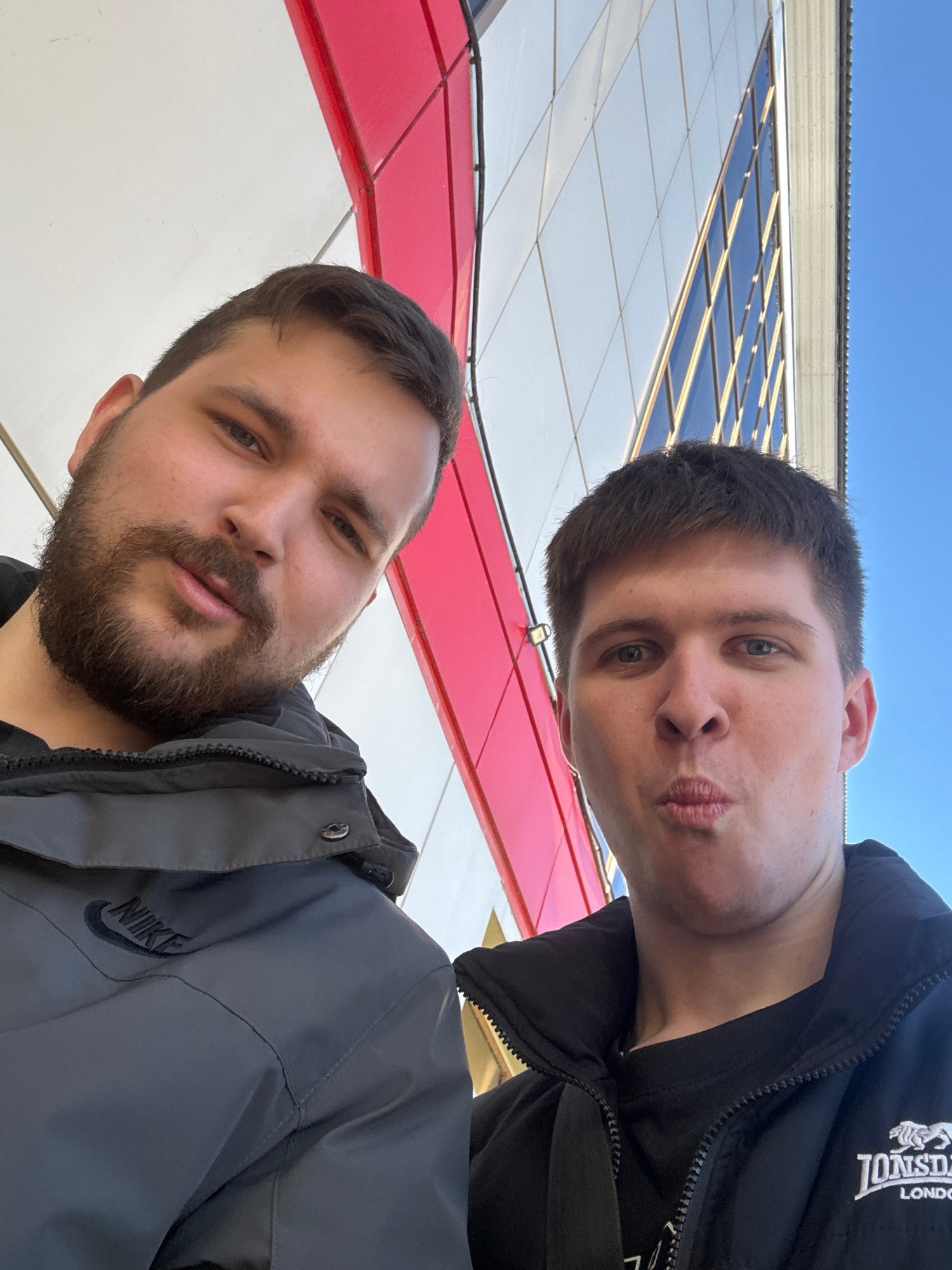 Two men take a selfie in front of a building. The building has white, red, and glass paneling. The man at the top is wearing a black jacket with a "LONSDALE LONDON" logo. The man at the bottom is wear…read more