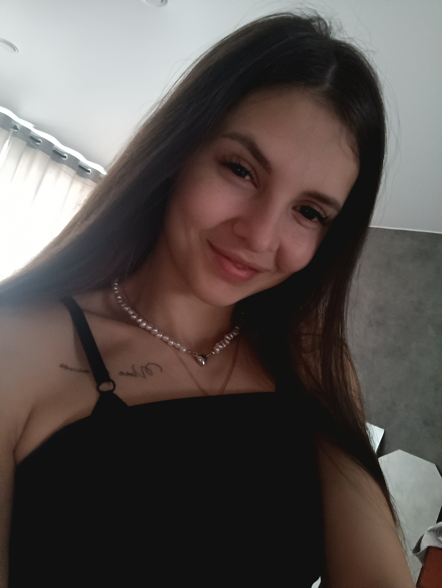 A woman is centered in the frame, appearing to take a selfie. She has long, dark hair and is smiling. She is wearing a black top and a pearl necklace with a pendant. A tattoo is visible on her upper l…read more