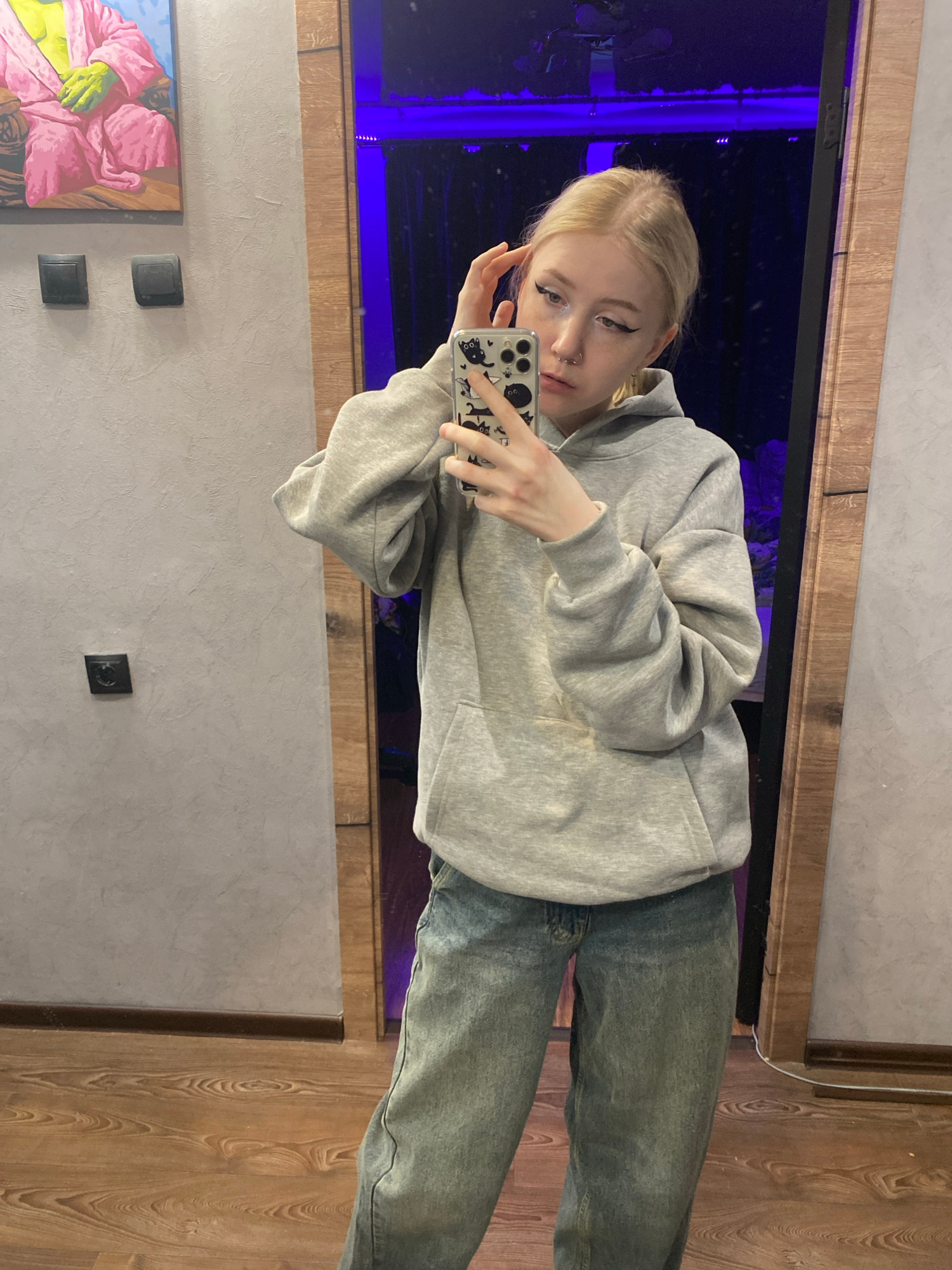 A young woman with blonde hair is taking a selfie in a mirror. She is wearing a gray hoodie and jeans. The mirror reflects a room with wooden floors and gray walls. There is a painting on the wall, alβ¦read more