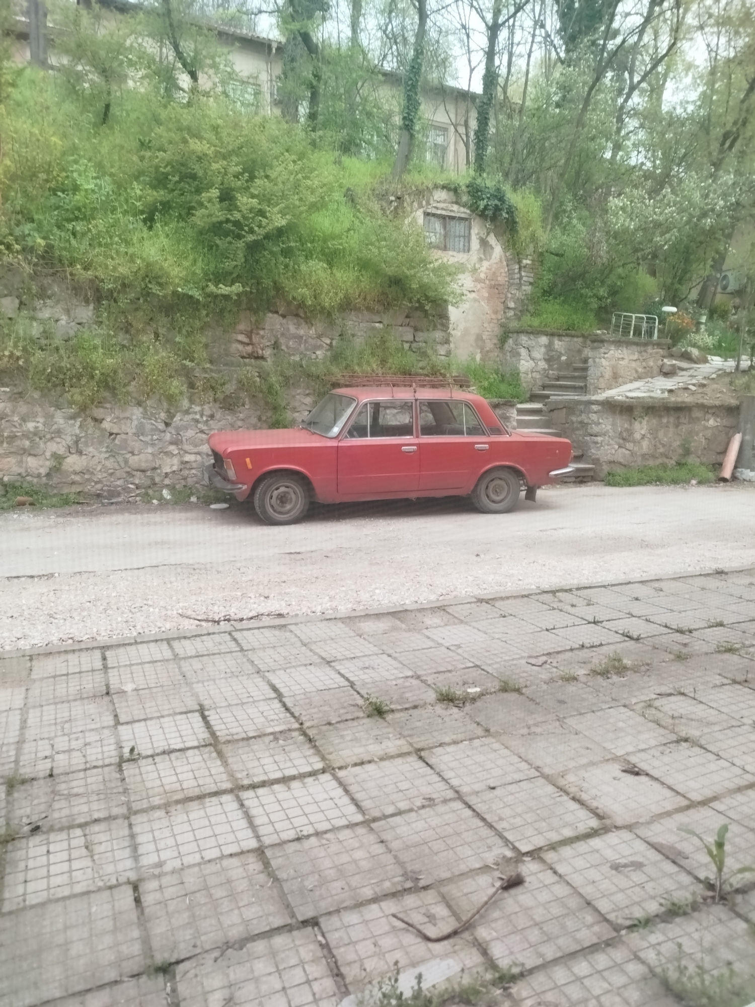 A red four-door sedan is parked on a dirt and gravel road next to a stone wall. Behind the wall is a green hillside with buildings partially visible. The foreground is a paved area with square tiles.…read more
