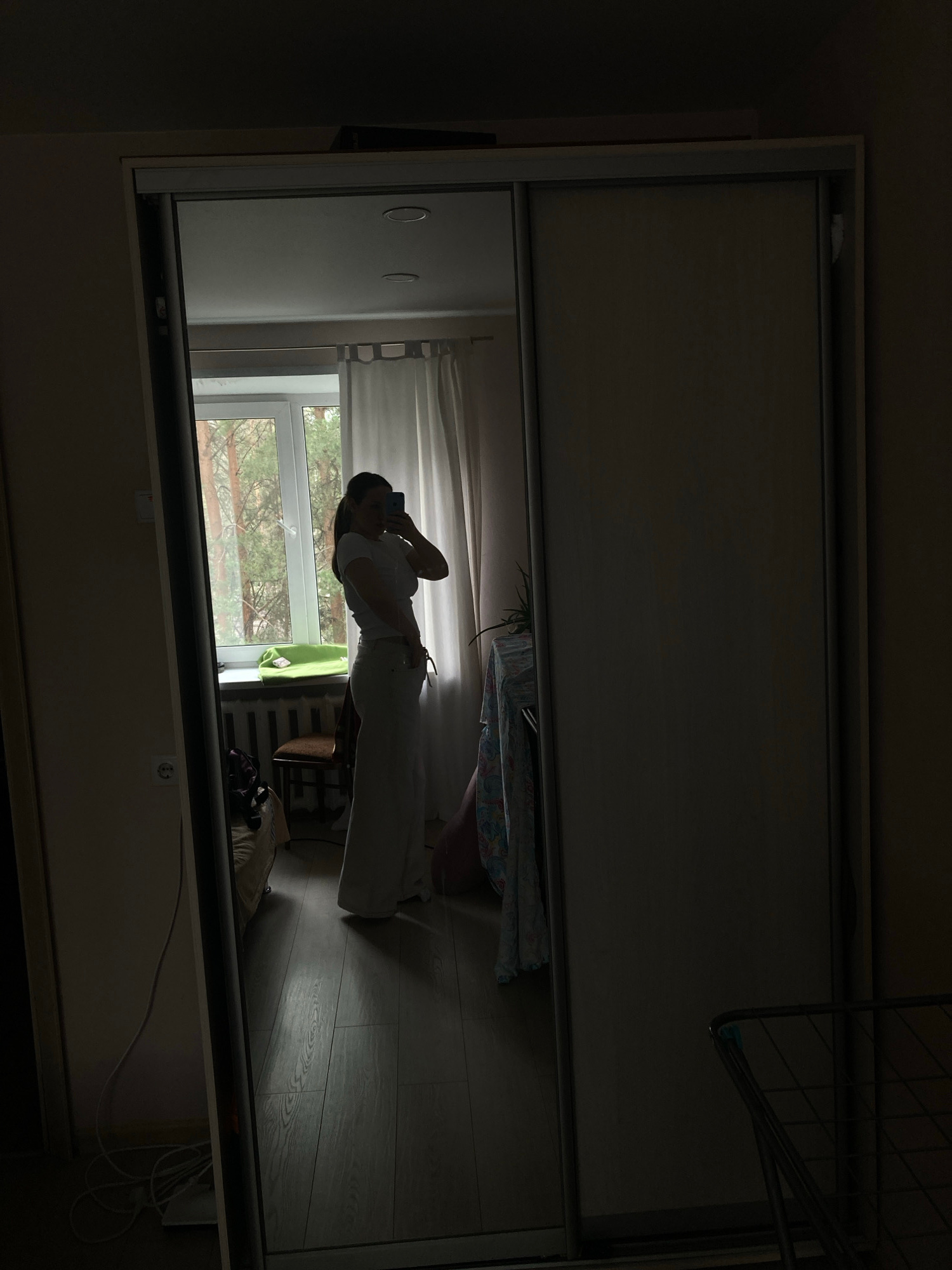The image shows a reflection in a mirrored wardrobe or sliding door. The reflection reveals a room with a window looking out onto a view of trees. A woman is seen holding a phone, possibly taking a ph…read more