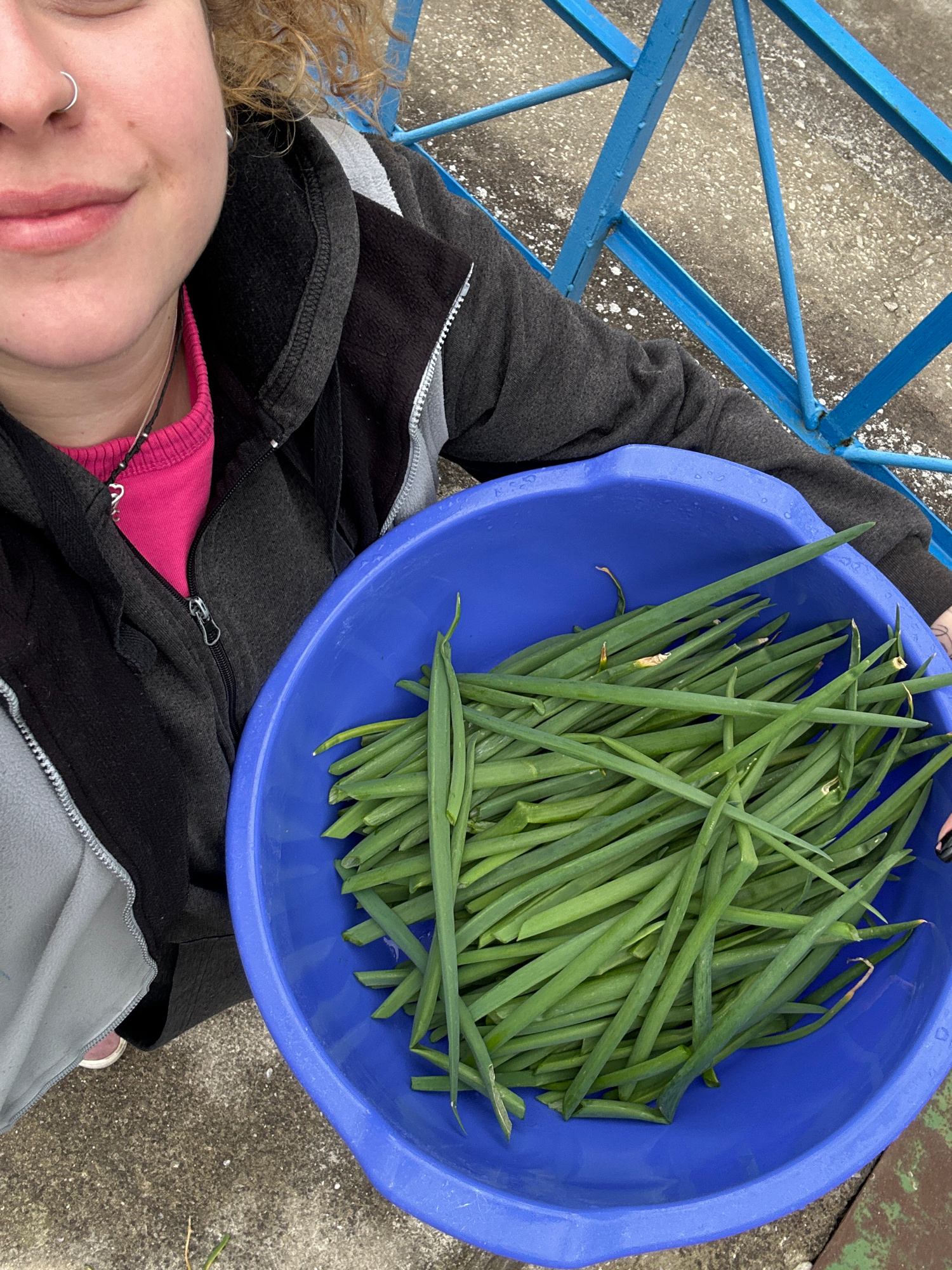 A first-person, close-up shot shows a fair-skinned person with curly blonde hair, a nose ring, and pink lips. They are wearing a gray and black zip-up jacket over a pink top. A blue plastic bowl fille…read more