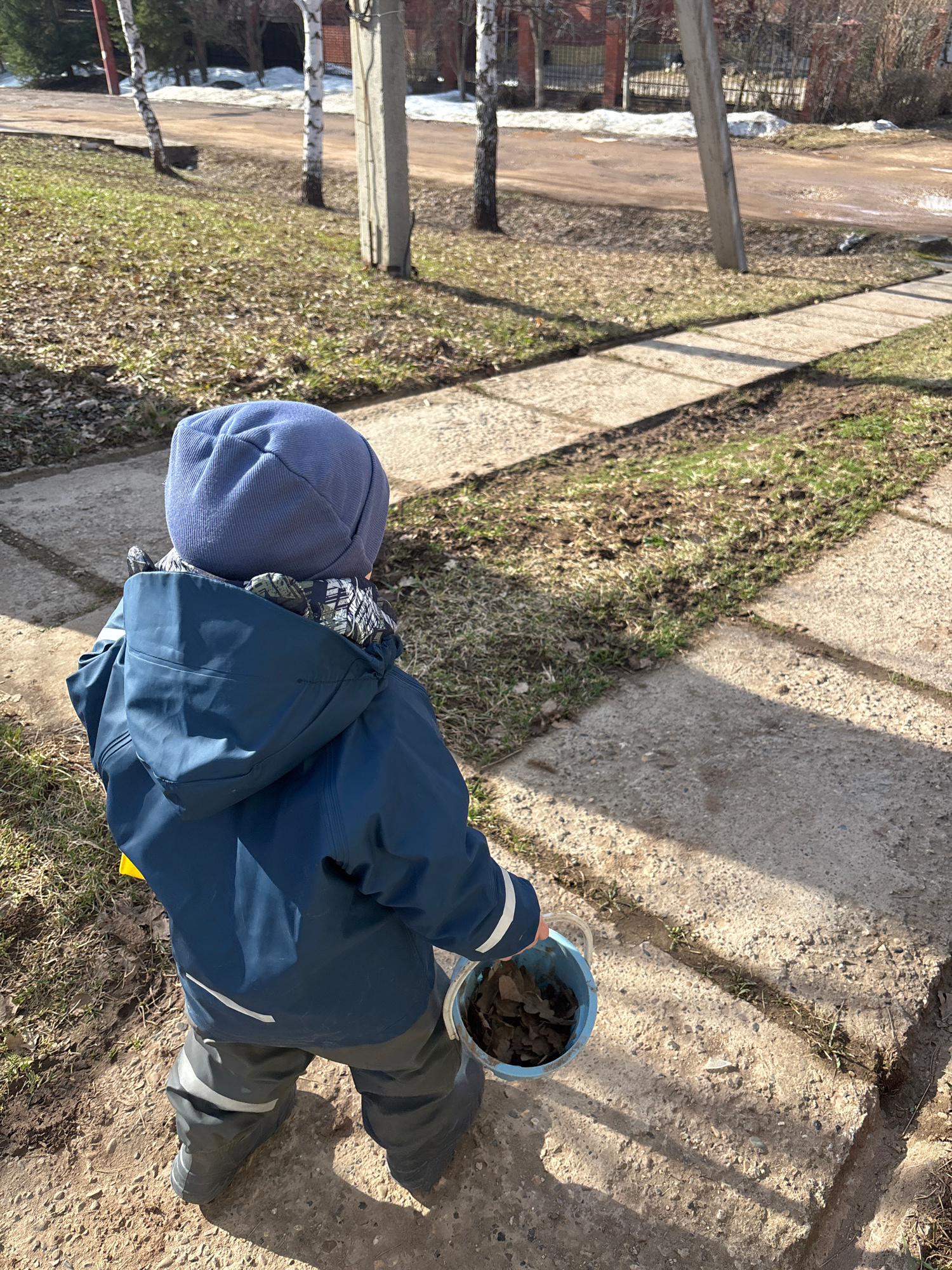A child is standing on a concrete walkway adjacent to a grass and dirt patch. They are facing the right side of the frame and are wearing a blue hat, a blue jacket, and grey boots with reflective stri…read more