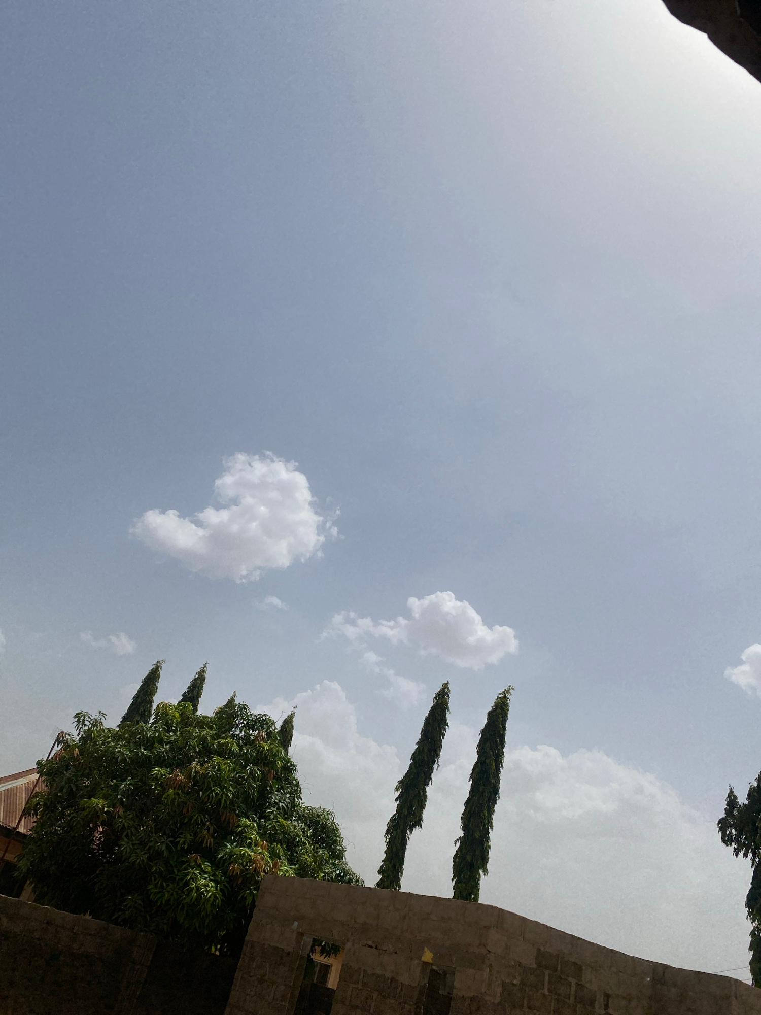 The image shows a low-angle view of the sky, trees, and a building in Rido, Nigeria. The sky is pale blue with scattered white clouds. Several tall, thin trees with dark green foliage are positioned t…read more