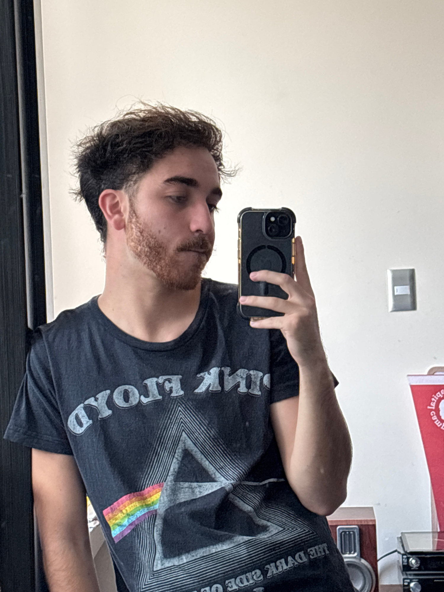 A person is taking a selfie in a room. The person is wearing a dark t-shirt with a Pink Floyd "Dark Side of the Moon" graphic. The room has a white wall, a light switch, and some items on a shelf. The…read more
