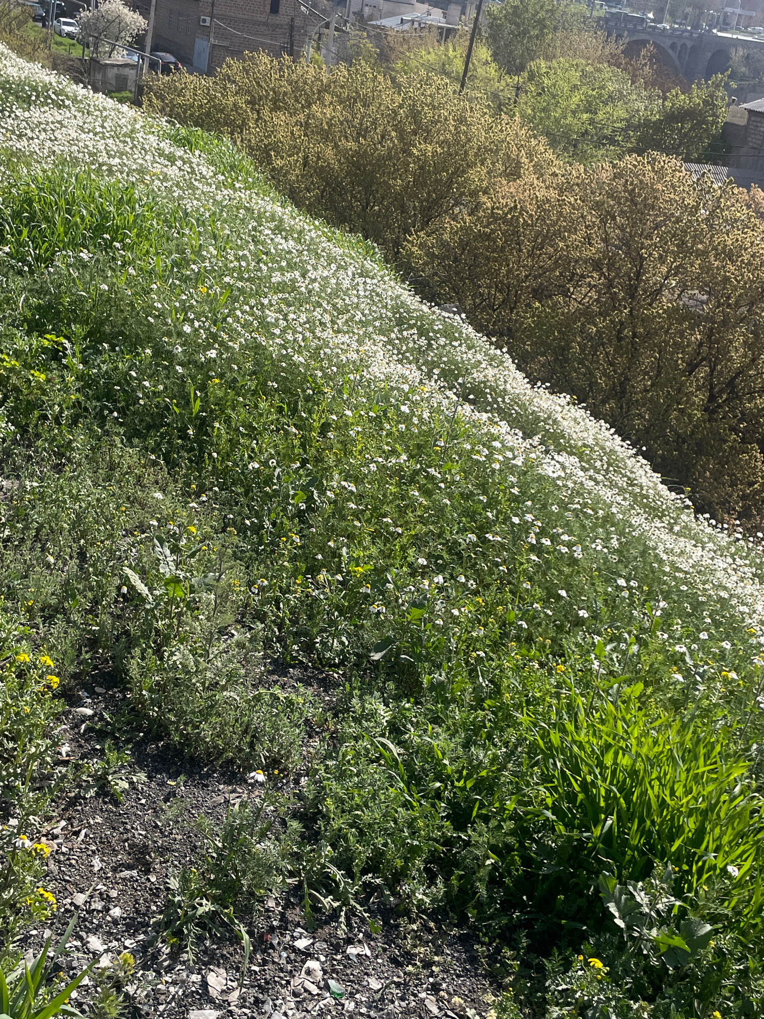 The image displays a vibrant spring landscape on a hillside, transitioning from natural flora to an urban backdrop, captured in bright daylight under clear skies. The majority of the foreground and m…read more