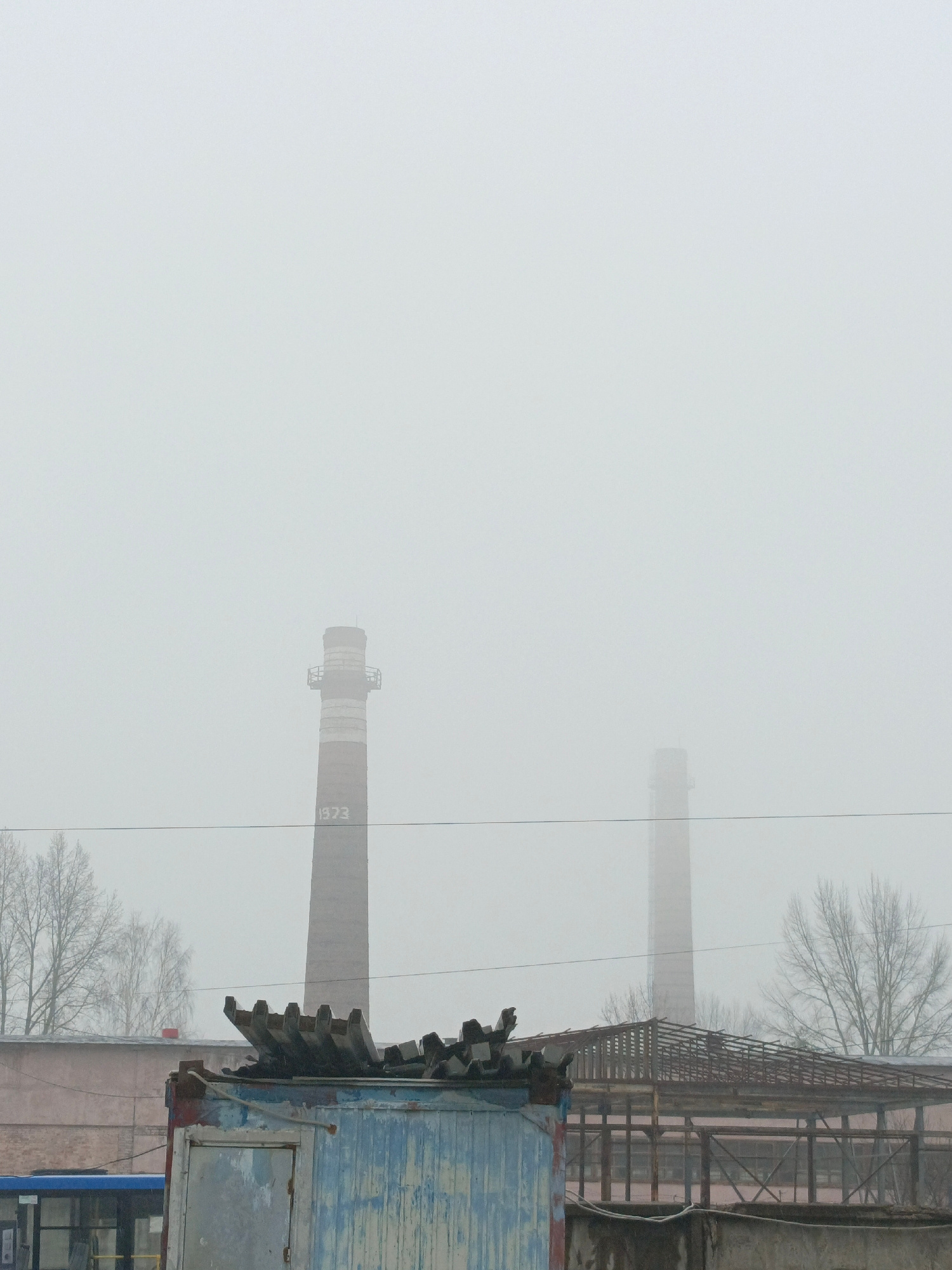 The image shows a foggy, overcast day in Noviy, Russia. In the background, two tall brick smokestacks are visible, with "1973" painted on the closer one. In the foreground, there's a dilapidated struc…read more