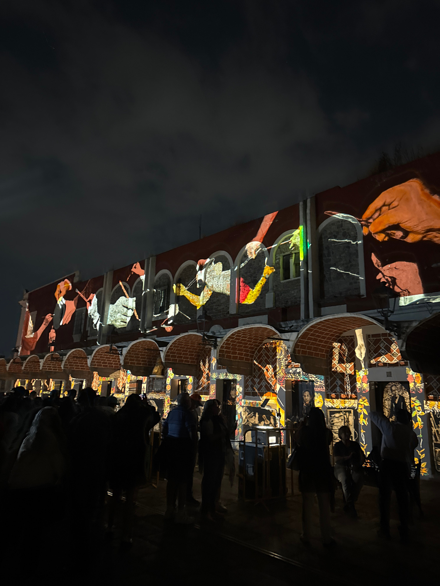 The image shows the facade of a building in Puebla, Mexico, illuminated by projections. The projections display various images including hands, figures, and geometric patterns. People are standing in…read more