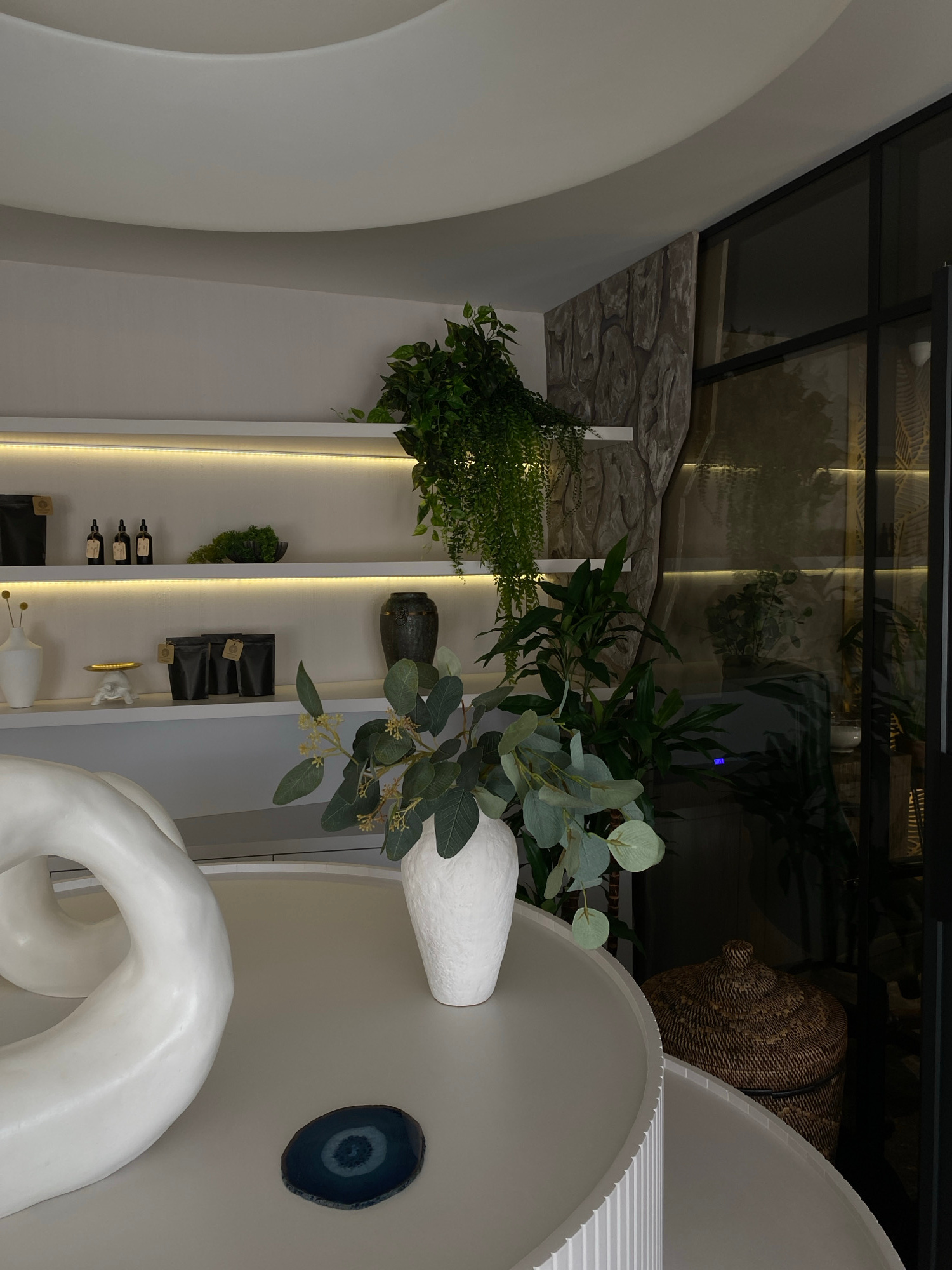 A still-life arrangement is featured in a well-lit room. Shelves are visible with a variety of decorative items. A green plant cascades down from the top shelf. A white vase holds greenery. There is a…read more