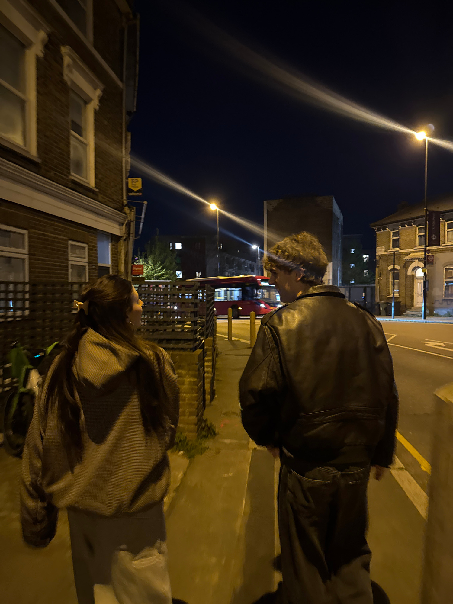 Two individuals are standing on a sidewalk near a street at night. The first individual, presumably male, is wearing a black leather jacket. The second individual, seemingly female, is wearing a dark-…read more