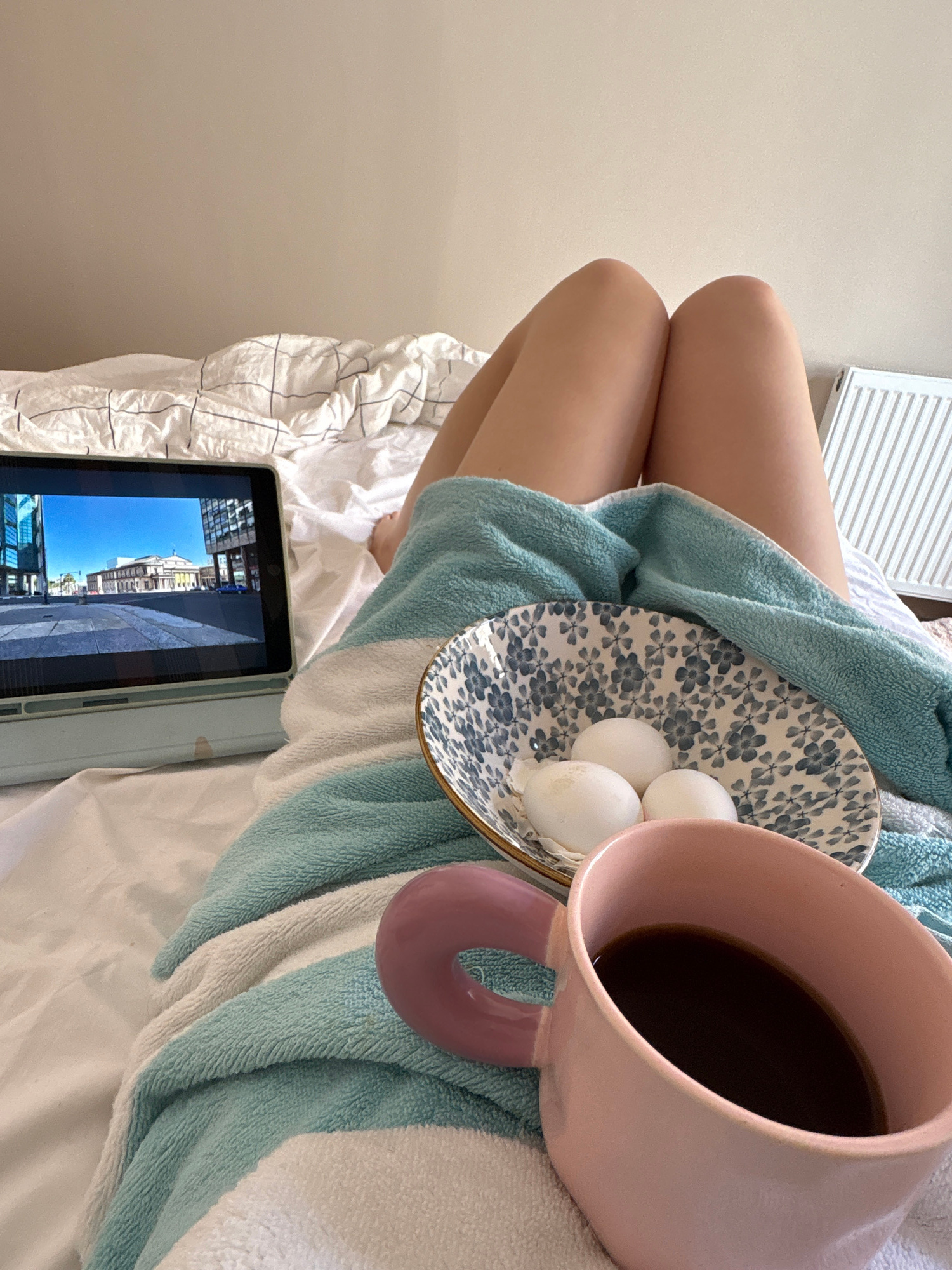 A woman is seated on a bed in an indoor environment, possibly a hotel room in Yerevan, Armenia, indicated by the cityscape displayed on a tablet. The woman's legs are visible and she is wearing a blue…read more