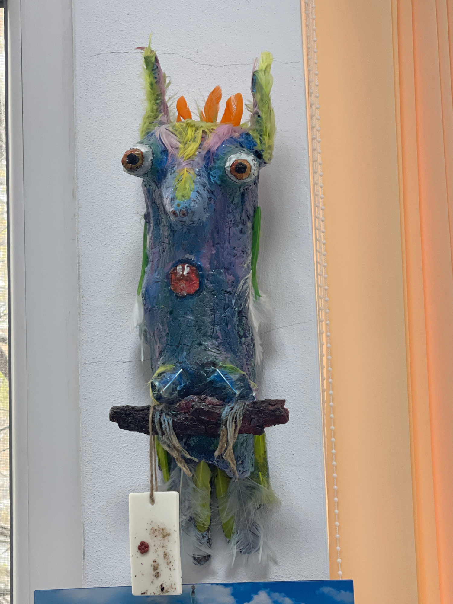A horizontal close-up shows a handcrafted, colorful artwork of indeterminate origin, mounted on a white wall. The artwork features a roughly cylindrical form, possibly made of wood or clay, with a blu…read more