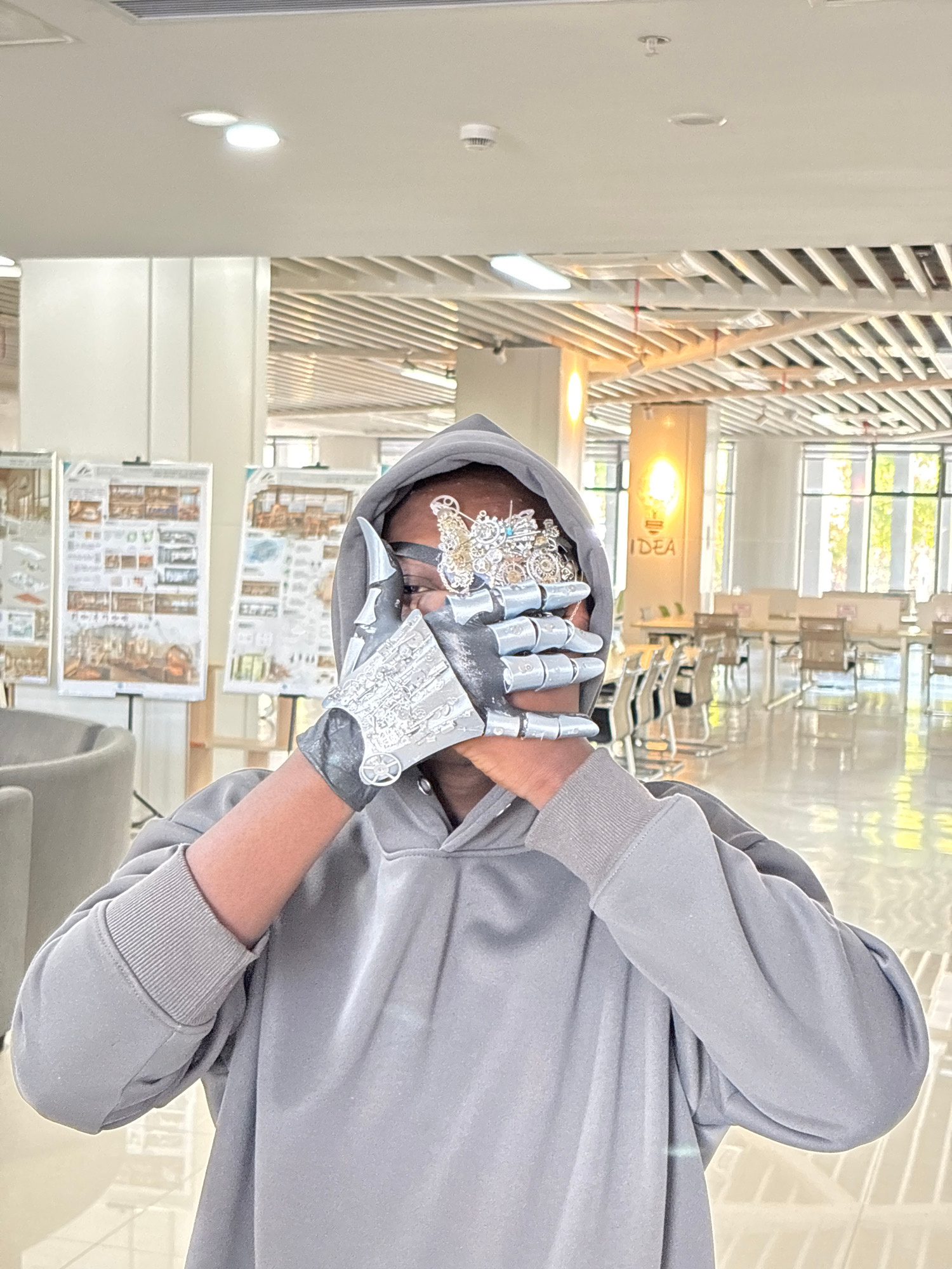 A person in a grey hooded sweatshirt is covering their face with their hands. One hand is covered by a silver metallic glove with intricate, mechanical designs. The location appears to be a modern int…read more