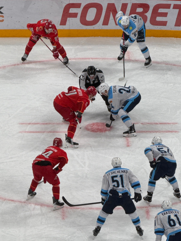 An overhead view captures an active moment during an ice hockey game. Players from two teams, one wearing light blue and white jerseys and the other in red jerseys, are clustered on a white ice rink.…read more