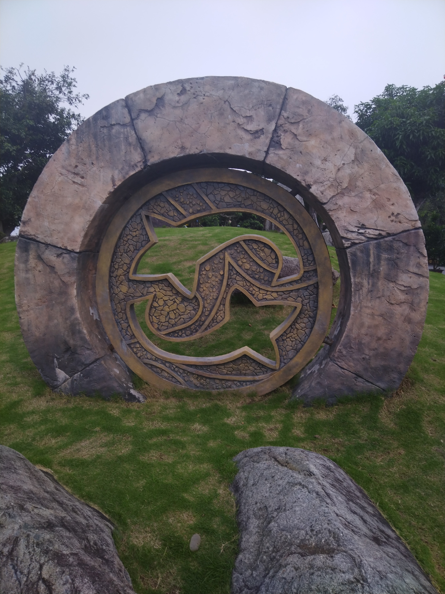 The image depicts a circular stone structure with an intricate design in the center, located outdoors in Hong Gai Ward, Vietnam. The structure appears to be a decorative or artistic installation, poss…read more