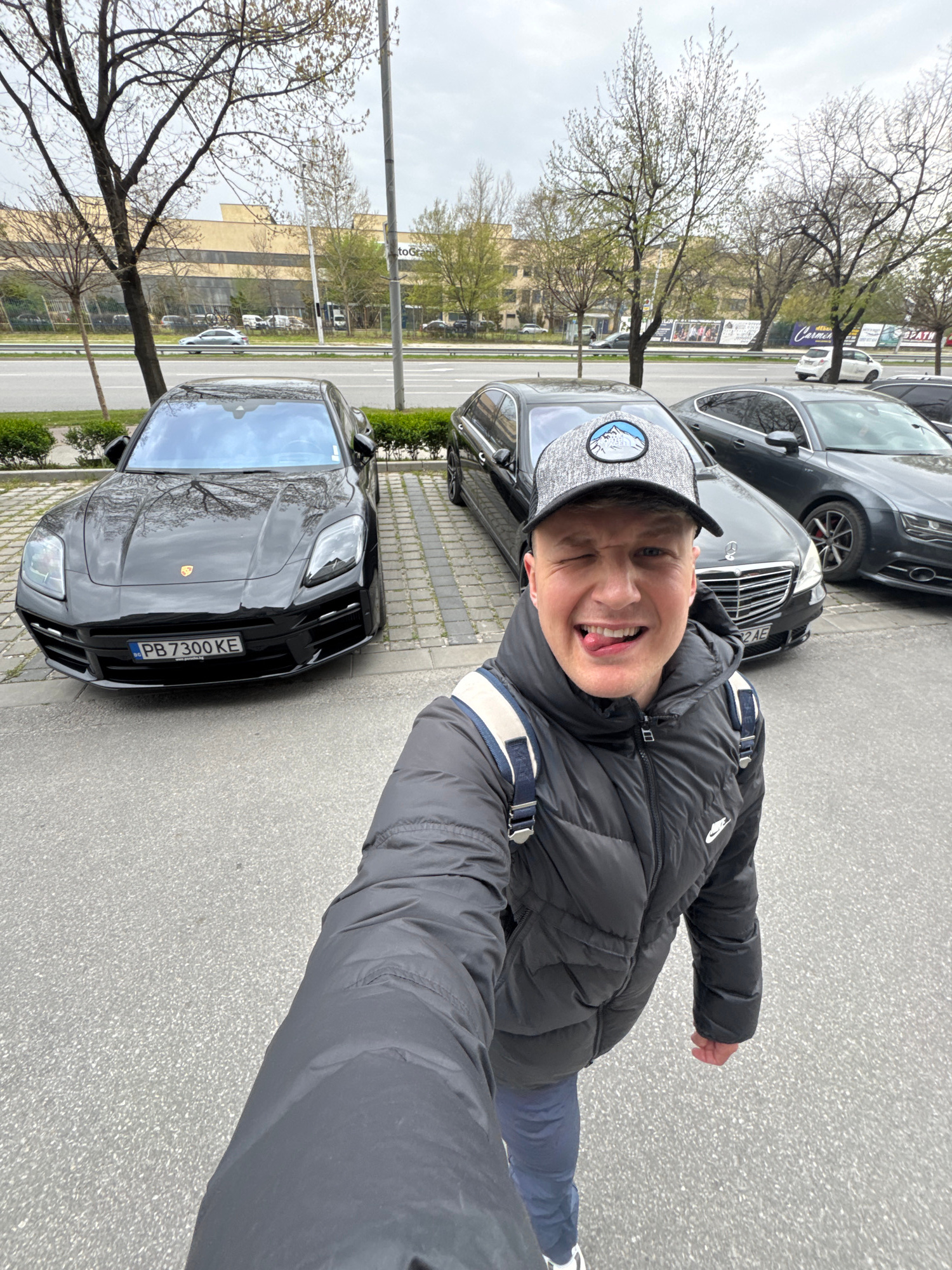 The image is a selfie, with the photographer tilting the camera. A person with a cap and a gray jacket is in the foreground, sticking out their tongue. Behind them are parked vehicles, including a bla…read more