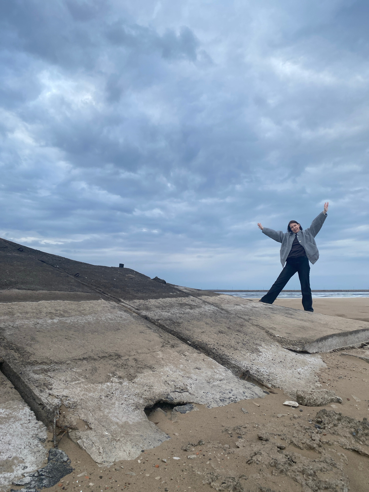 This image, captured in Chaikovsky, Russia, features a person striking a dynamic pose on a concrete structure beside a body of water under an overcast sky. The central subject is a young adult, possi…read more