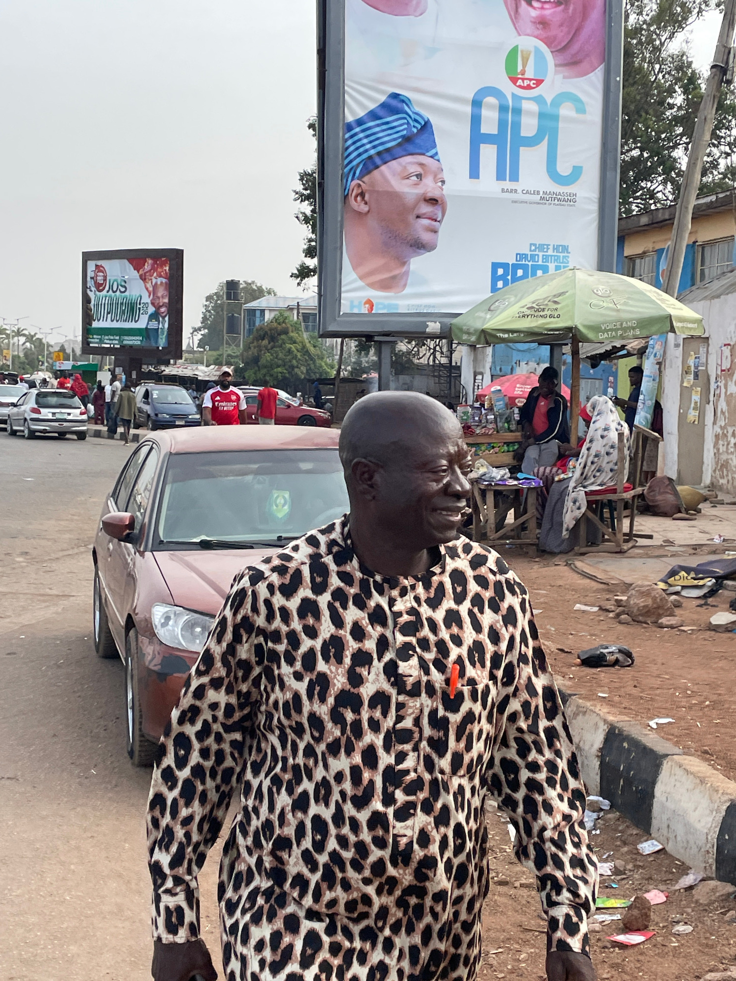 The image depicts a man in a leopard-print shirt standing near a street in Jos, Nigeria. A car is parked nearby. In the background, there are billboards promoting the APC party and a candidate named C…read more