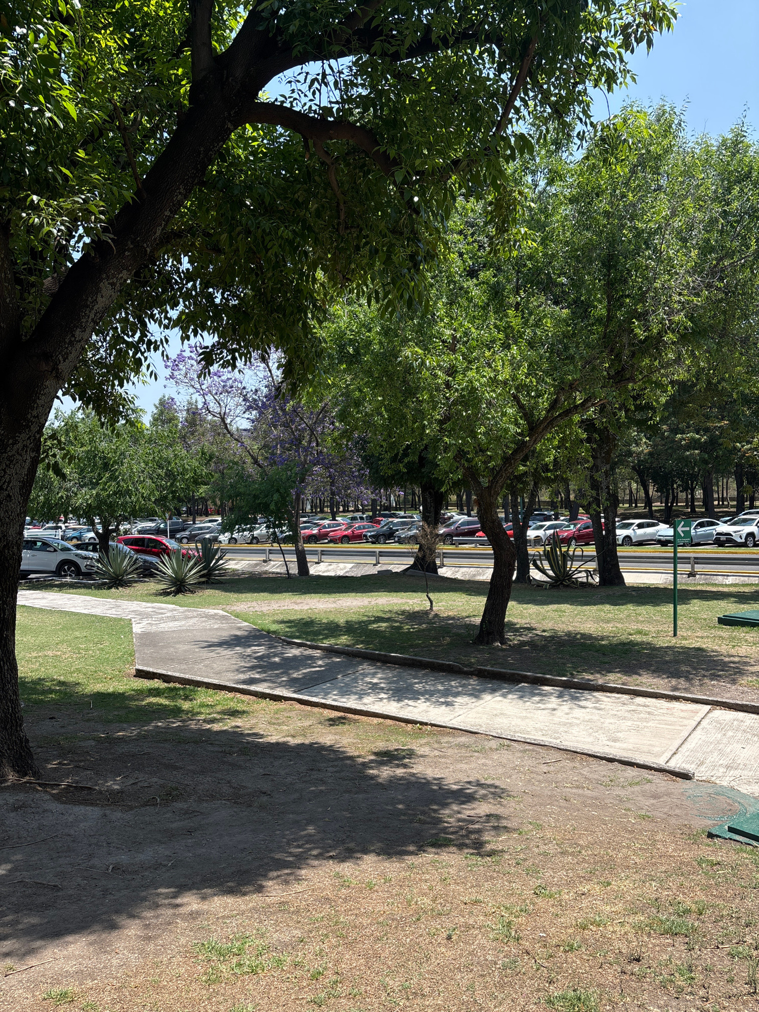 The image depicts a street scene in San Andrés Cholula, Mexico. Rows of parked cars line the street, partially obscured by trees with green foliage. Purple flowering trees (Jacaranda) are visible amon…read more