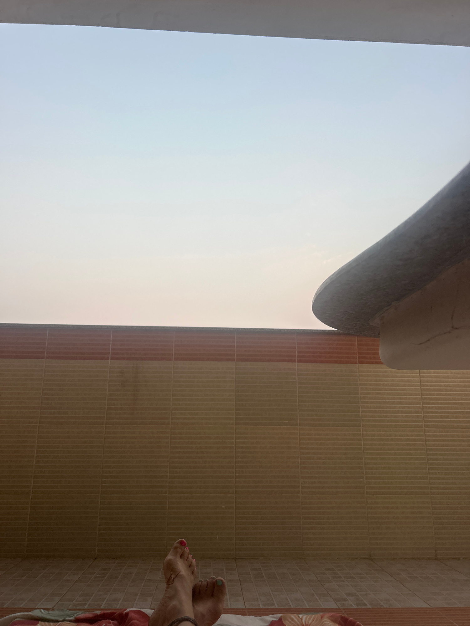 The image, likely taken in Puttaparthi, India, depicts a partial view of a bathroom. The right side shows a tiled wall with vertical, elongated rectangular tiles in alternating shades of tan and red.…read more