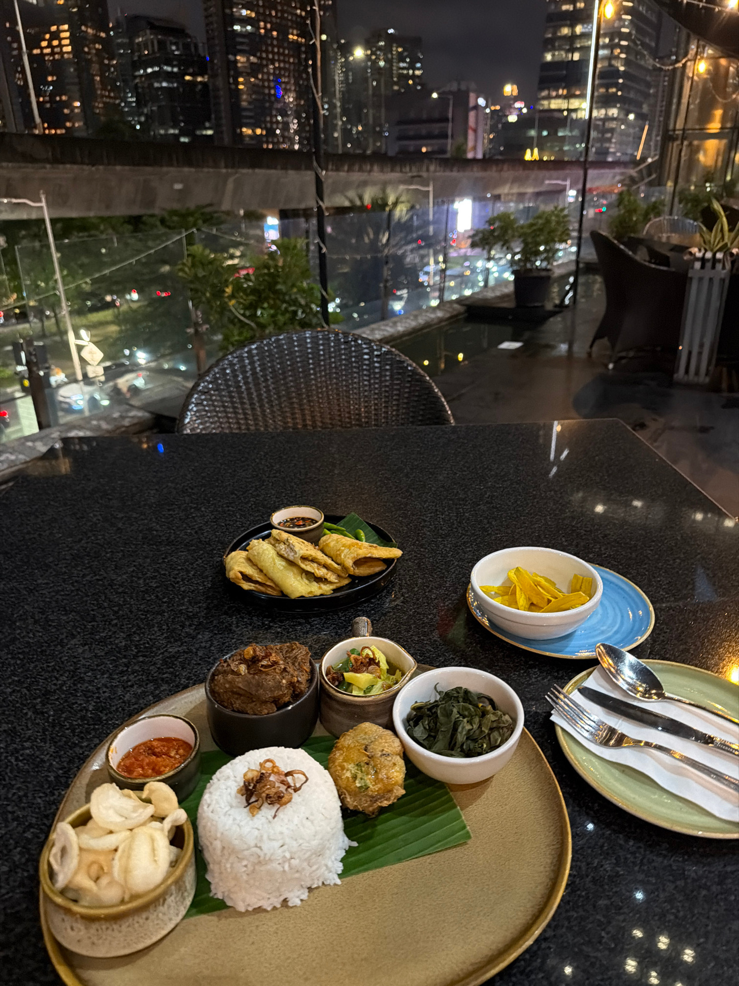 The photograph shows an overhead view of a meal presented on a black table in an indoor setting, with the night skyline of South Jakarta, Indonesia visible through a window. The meal consists of a pla…read more