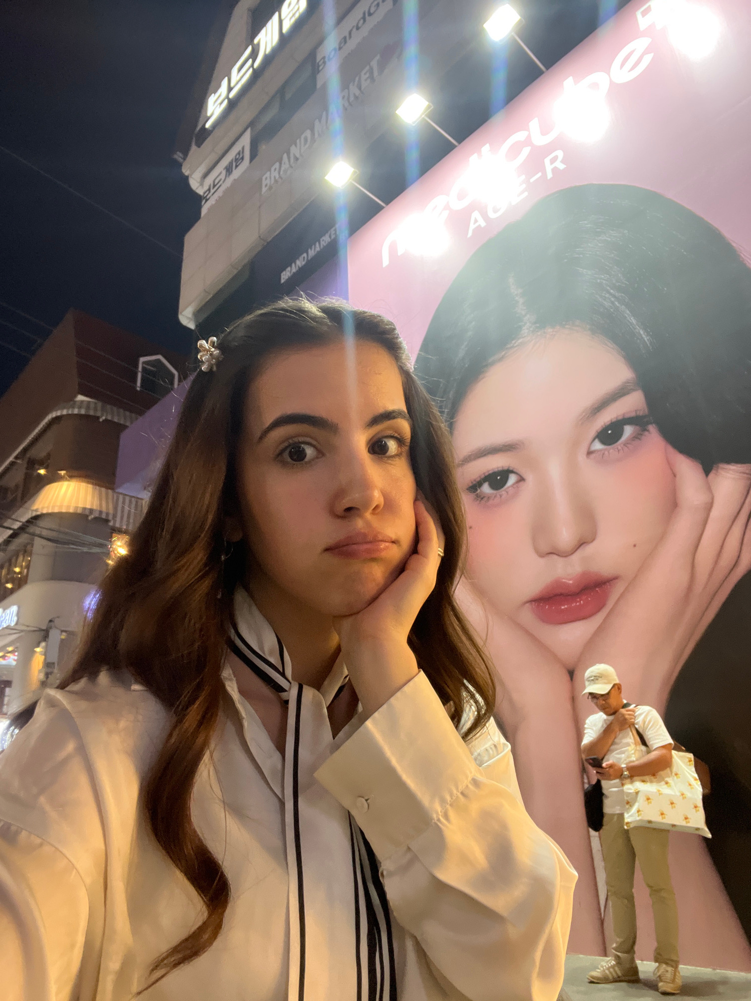 A young woman with long brown hair and a floral hair clip poses for a selfie in front of a large advertisement in Seoul, South Korea. She is wearing a white, collared shirt with black stripes and has…read more