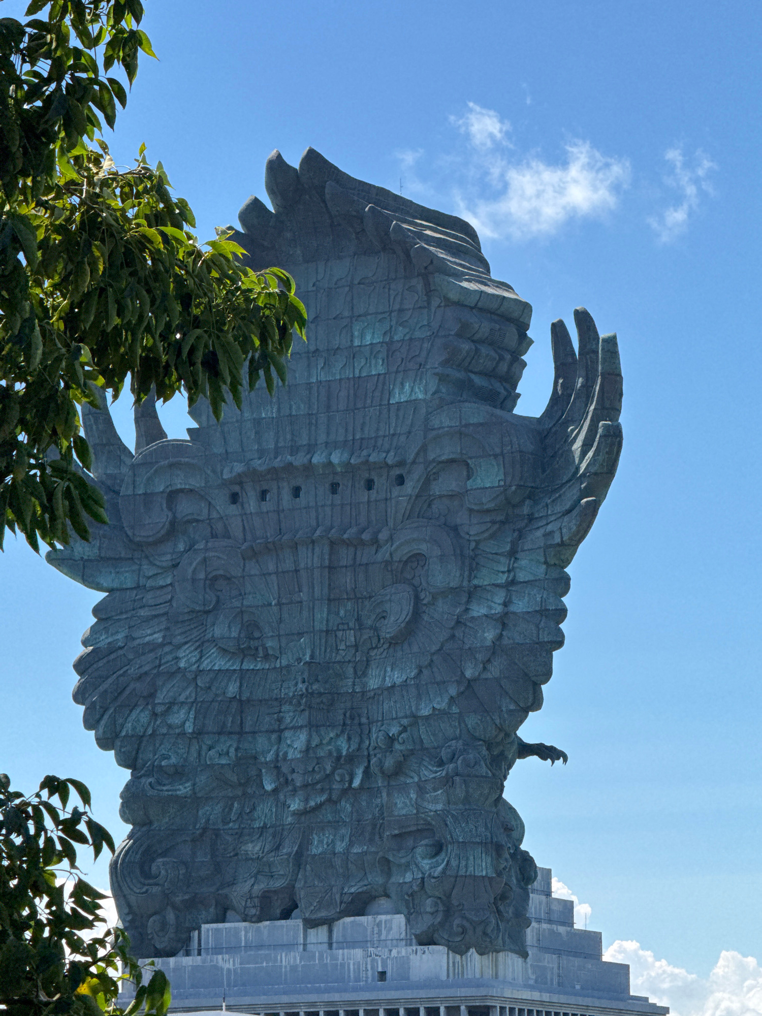The image depicts a low-angle shot of a large statue of the Garuda Wisnu Kencana, located in Kuta Selatan, Indonesia. The statue's prominent features include intricately designed wings constructed fro…read more