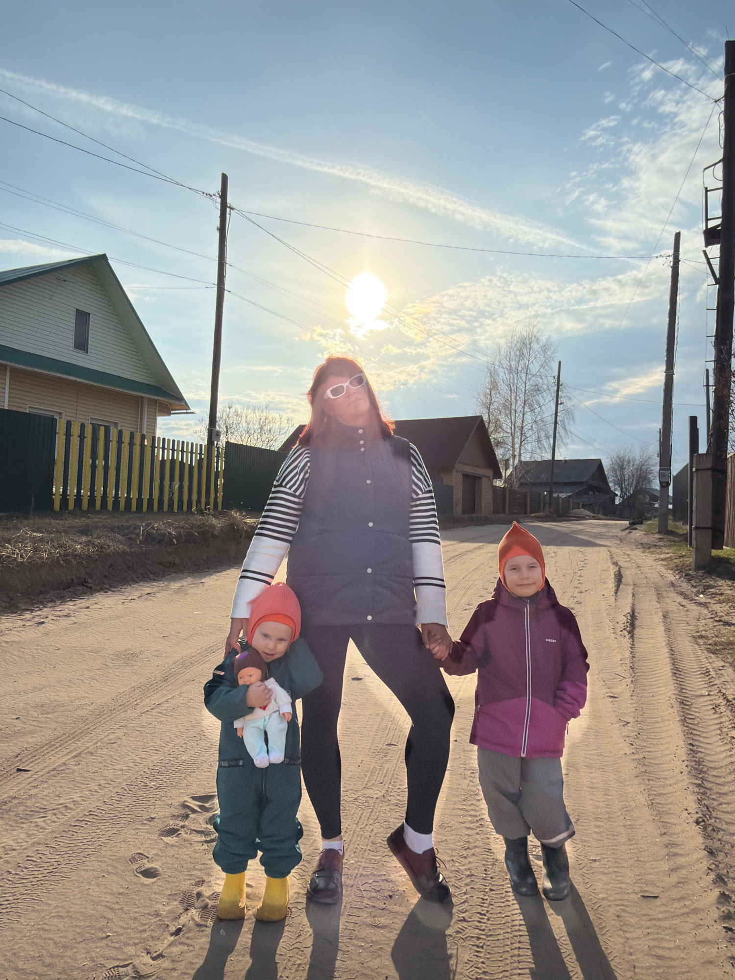 This image depicts an adult and two children walking on an unpaved dirt road under a bright sky in what appears to be a rural or semi-rural setting, consistent with Chaikovsky, Russia. The road shows…read more