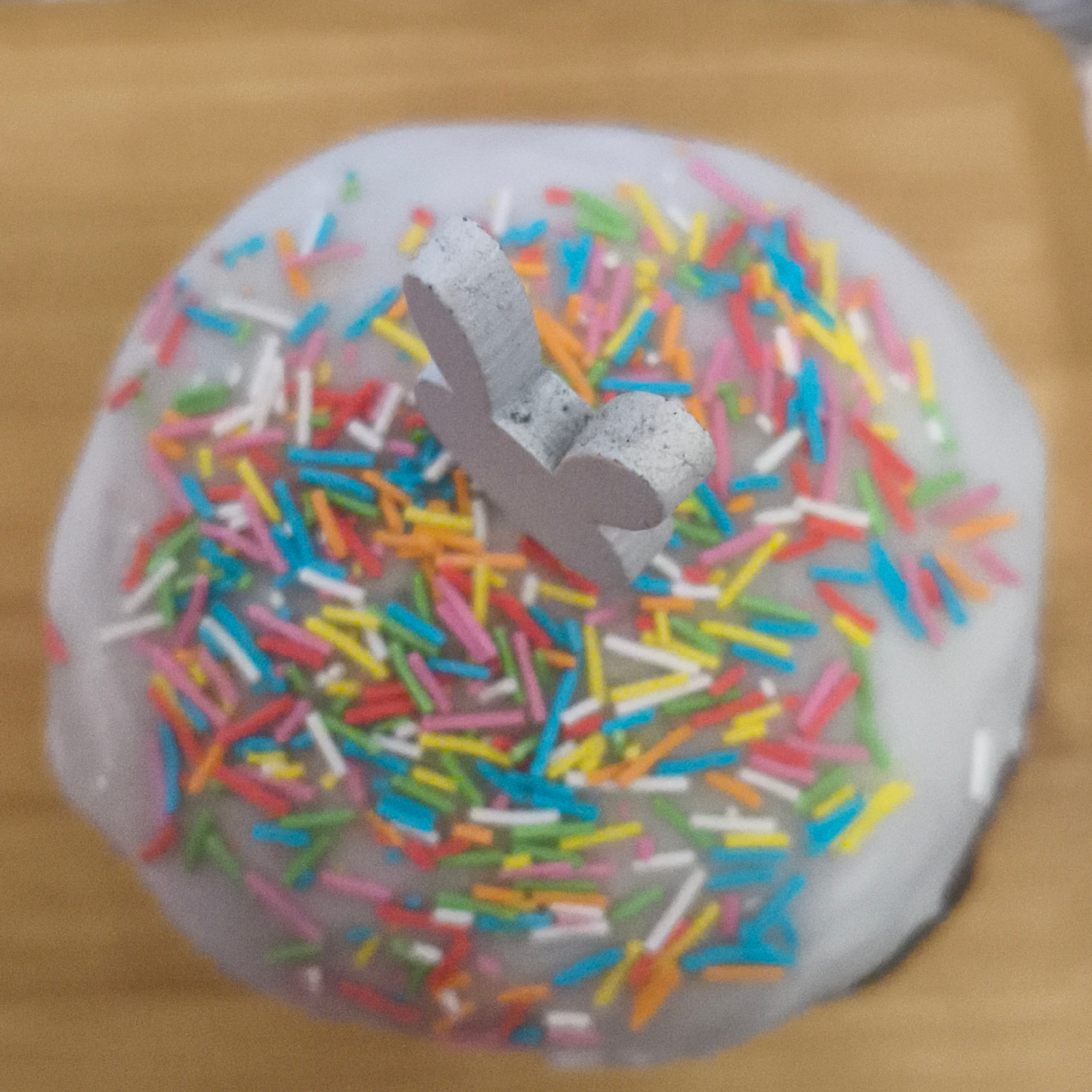 A close-up overhead shot depicts a frosted Easter cake. The cake is decorated with multicolored sprinkles and a small, gray, bunny-shaped adornment on top. The cake rests on a light brown wooden surfa…read more