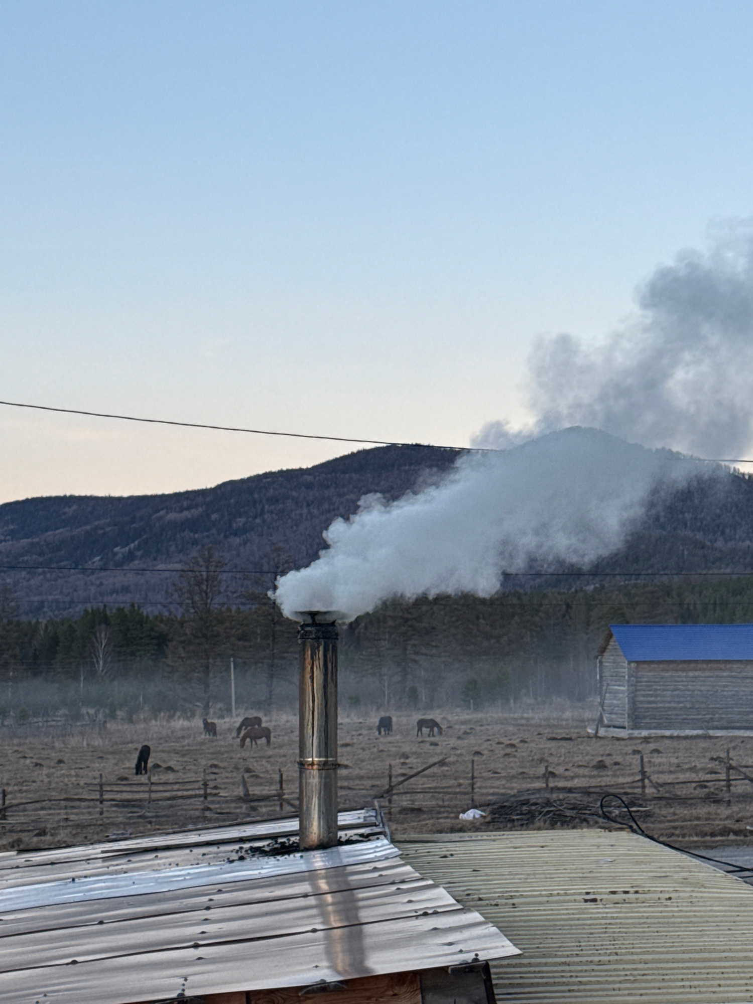 The image shows a landscape in what appears to be a rural setting. A mountain range is visible in the background. From what is likely a chimney, a thick plume of smoke or steam rises vertically. The b…read more