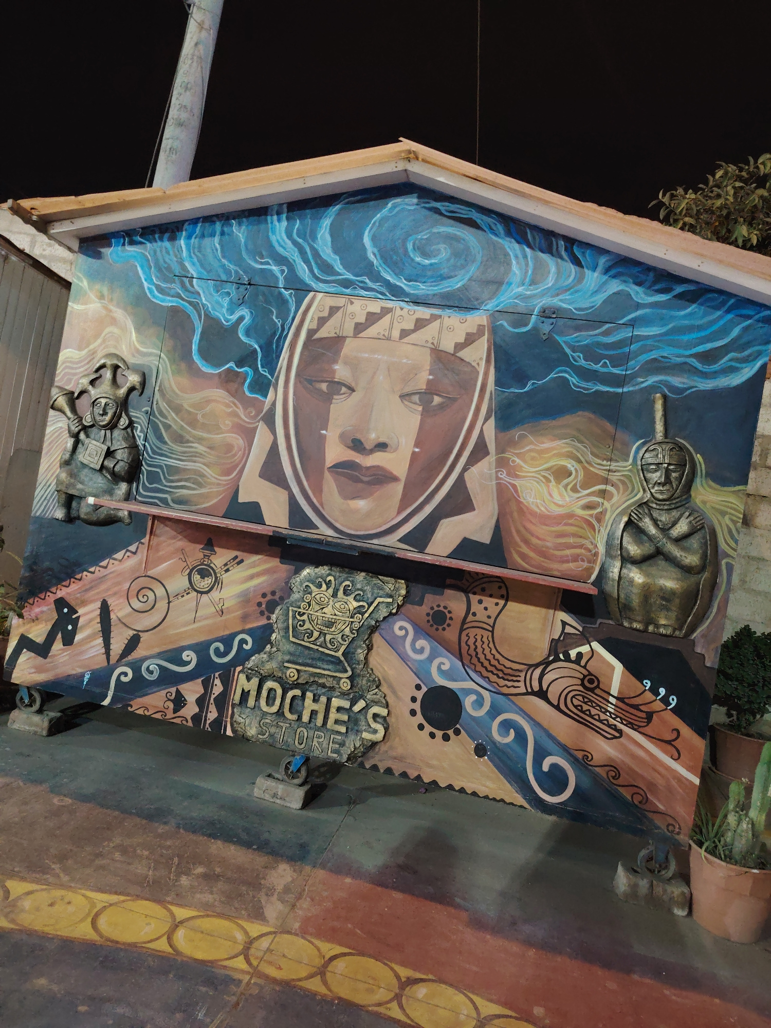 A photograph depicts a tilted wooden structure adorned with Moche art, likely serving as a storefront in Trujillo, Peru. The structure features a large mural of a Moche woman's face, flanked by sculpt…read more