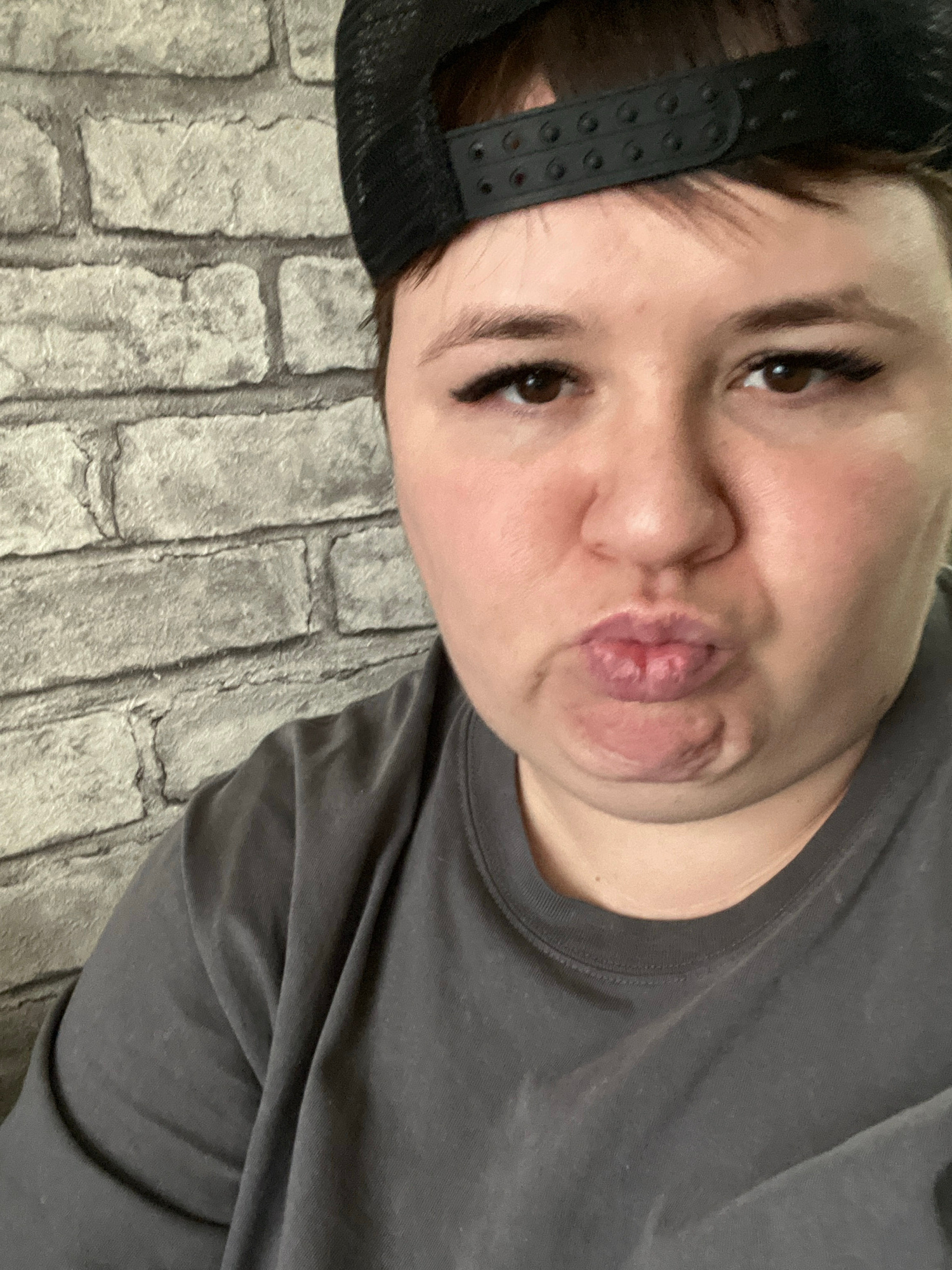 A selfie, apparently taken on a brick floor. The subject is wearing a dark-colored T-shirt and a backwards black baseball cap. The face is pale, with brown eyes and pursed lips. There is no evidence o…read more