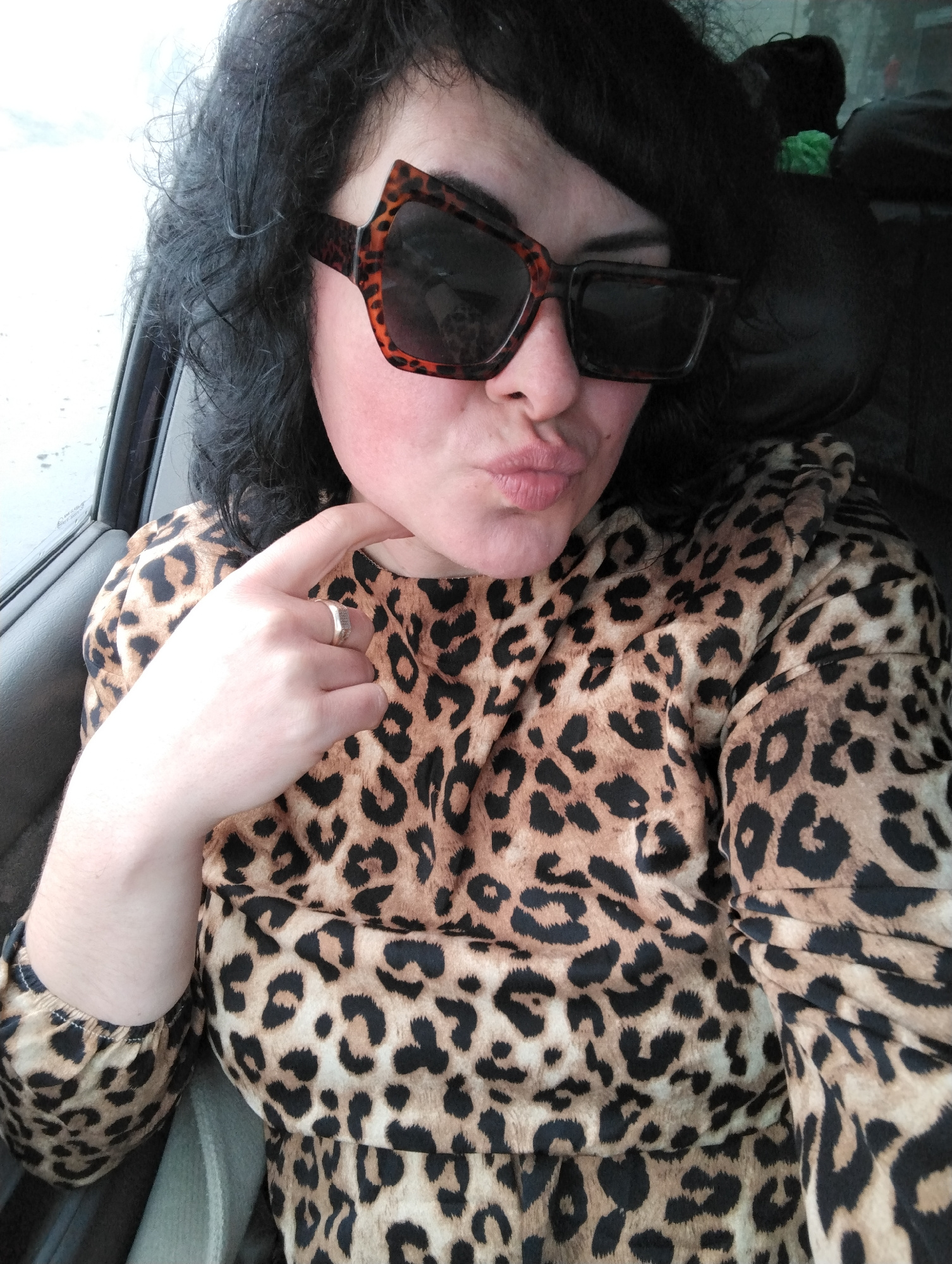 A woman with dark curly hair and bangs is posing for a selfie inside a car. She is wearing large, square sunglasses with a brown and black leopard print frame. She is also wearing a leopard print top.…read more