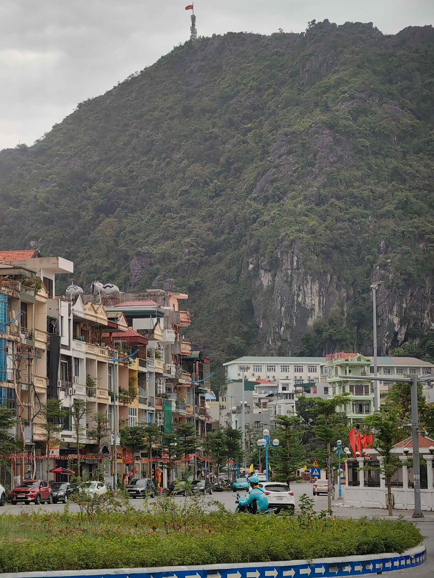 The image shows a street in Hong Gai Ward, Vietnam, with dense buildings on the left side and a large, mountainous backdrop. The buildings are varied in style, with a mix of balconies, windows, and ro…read more